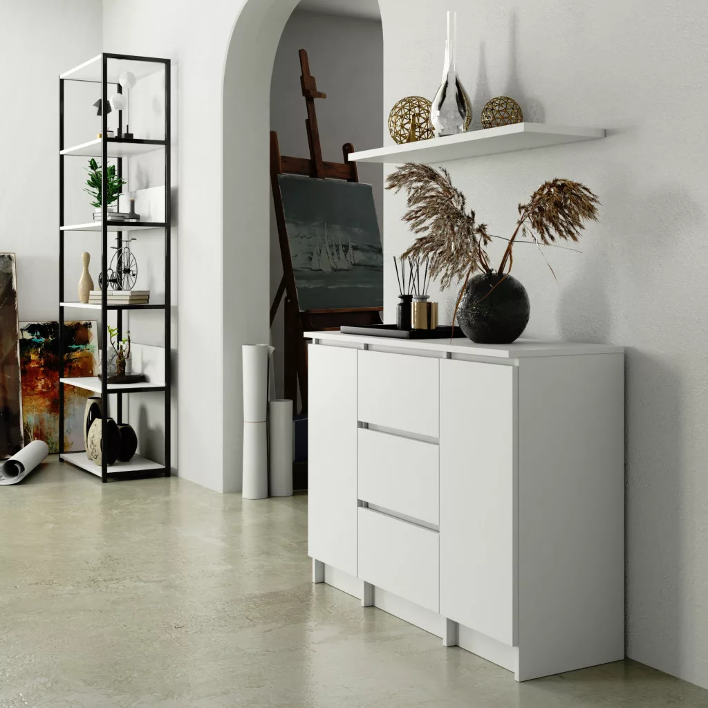 Modern, fehér komód 3 fiókkal és 2 ajtóval, amely tökéletes tárolási megoldást kínál a nappaliba vagy hálószobába. Tartós laminált lapból készült, ABS élzárással.