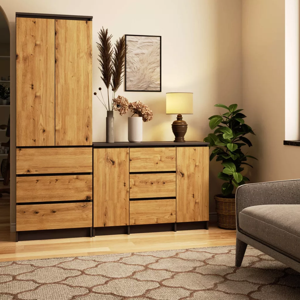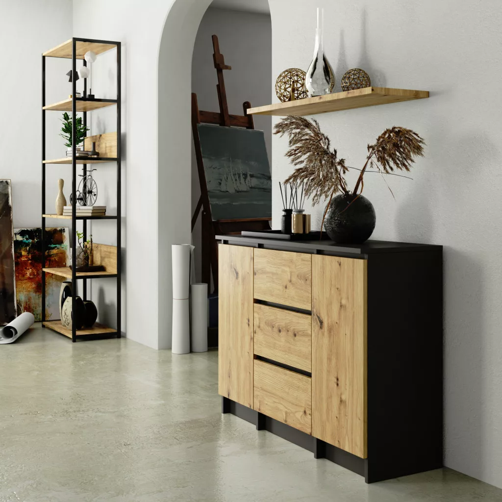 A K100 komód tökéletes egyensúlyt teremt a funkcionalitás és az esztétikum között. A 16 mm vastag kopásálló laminált lapokból készült bútor két ajtóval és három fiókkal kínál bőséges tárolóhelyet. A grafit szürke korpusz és az artisan tölgy frontok elegáns kontrasztot alkotnak.
