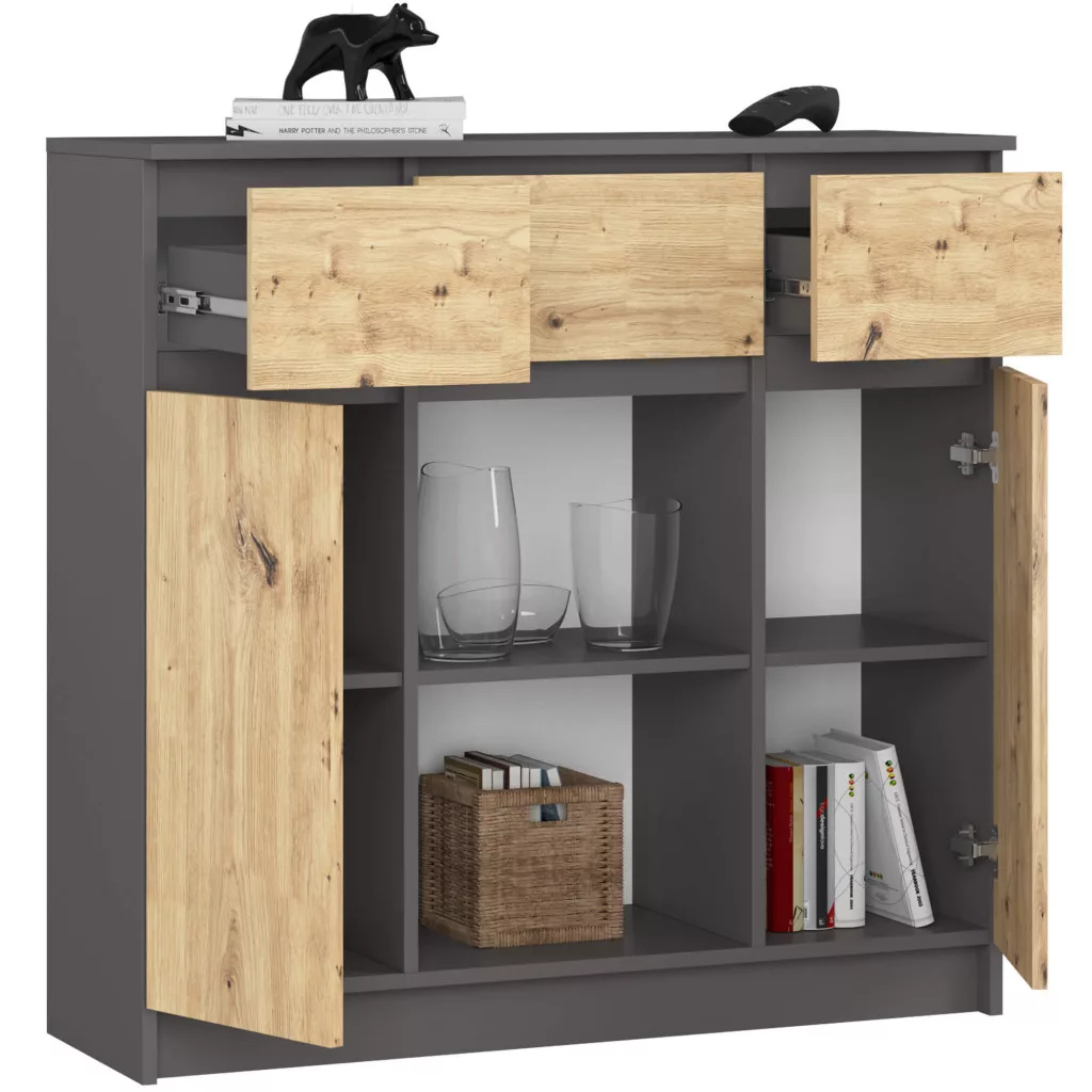 Elegáns, modern vonalvezetésű komód 3 fiókkal és 2 ajtóval, grafit szürke és artisan tölgy színkombinációban. Praktikus tárolási megoldás a nappaliba vagy hálószobába.
