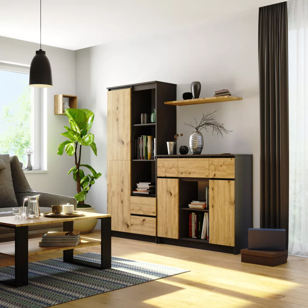 Ez a modern komód tökéletesen ötvözi a funkcionalitást és az esztétikumot. A grafit szürke korpusz és az artisan tölgy frontok harmonikus kontrasztot alkotnak, míg a 6 polc, 3 fiók és 2 ajtó bőséges tárolóhelyet biztosít.