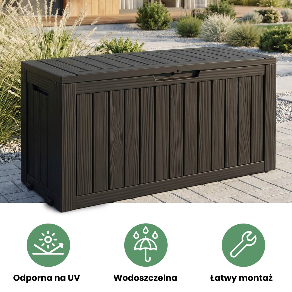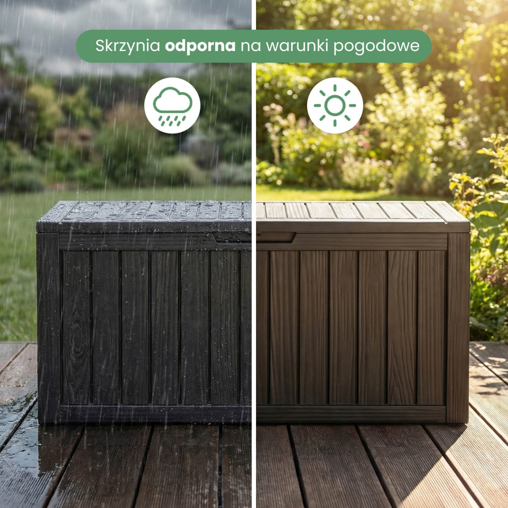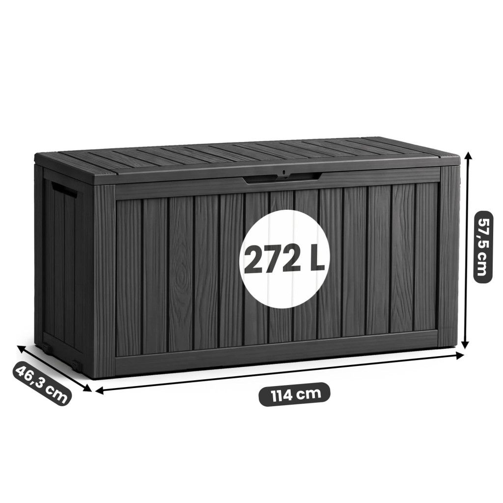A 272 literes kerti tároló láda bőséges helyet biztosít kerti eszközök, párnák és szezonális kellékek tárolására. Vízálló polipropilén anyagból készült, UV-szűrővel ellátva, fa textúrájú felülettel.