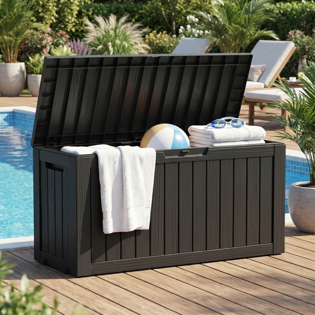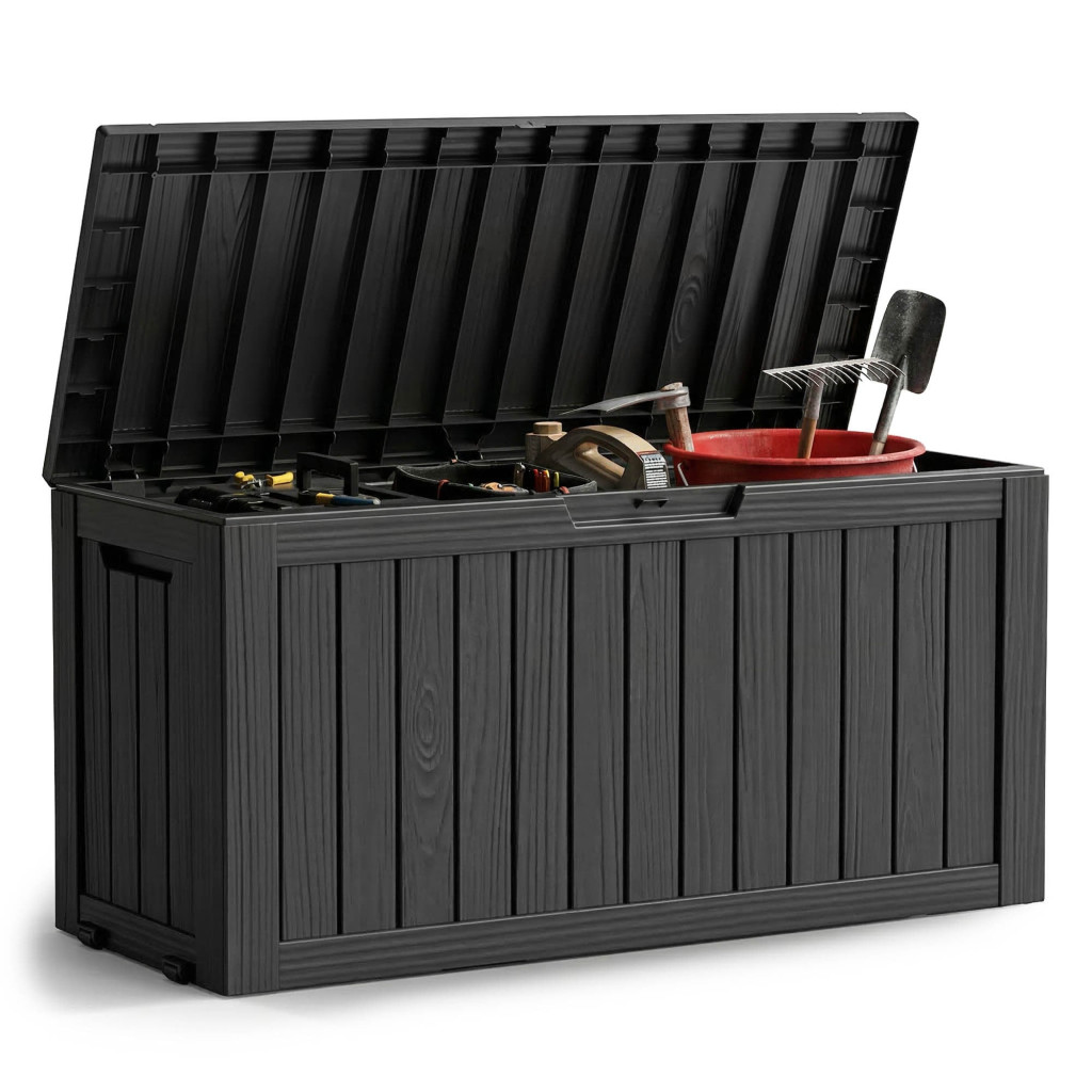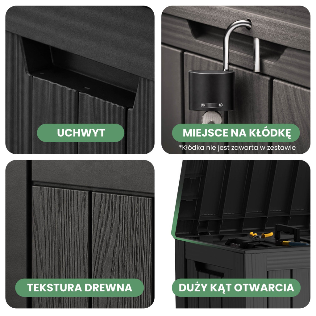 A 272 literes kerti tároló láda bőséges helyet biztosít kerti eszközök, párnák és szezonális kellékek tárolására. Vízálló polipropilén anyagból készült, UV-szűrővel ellátva, fa textúrájú felülettel.