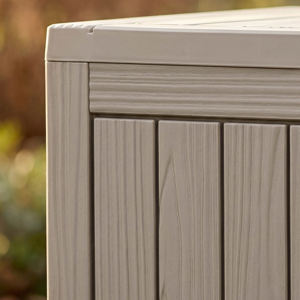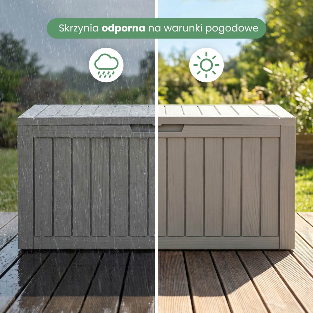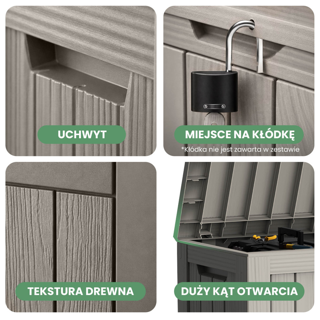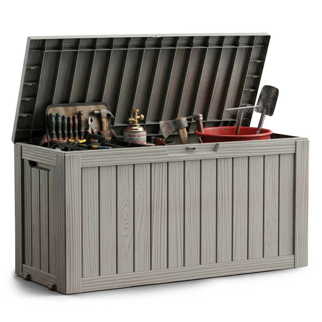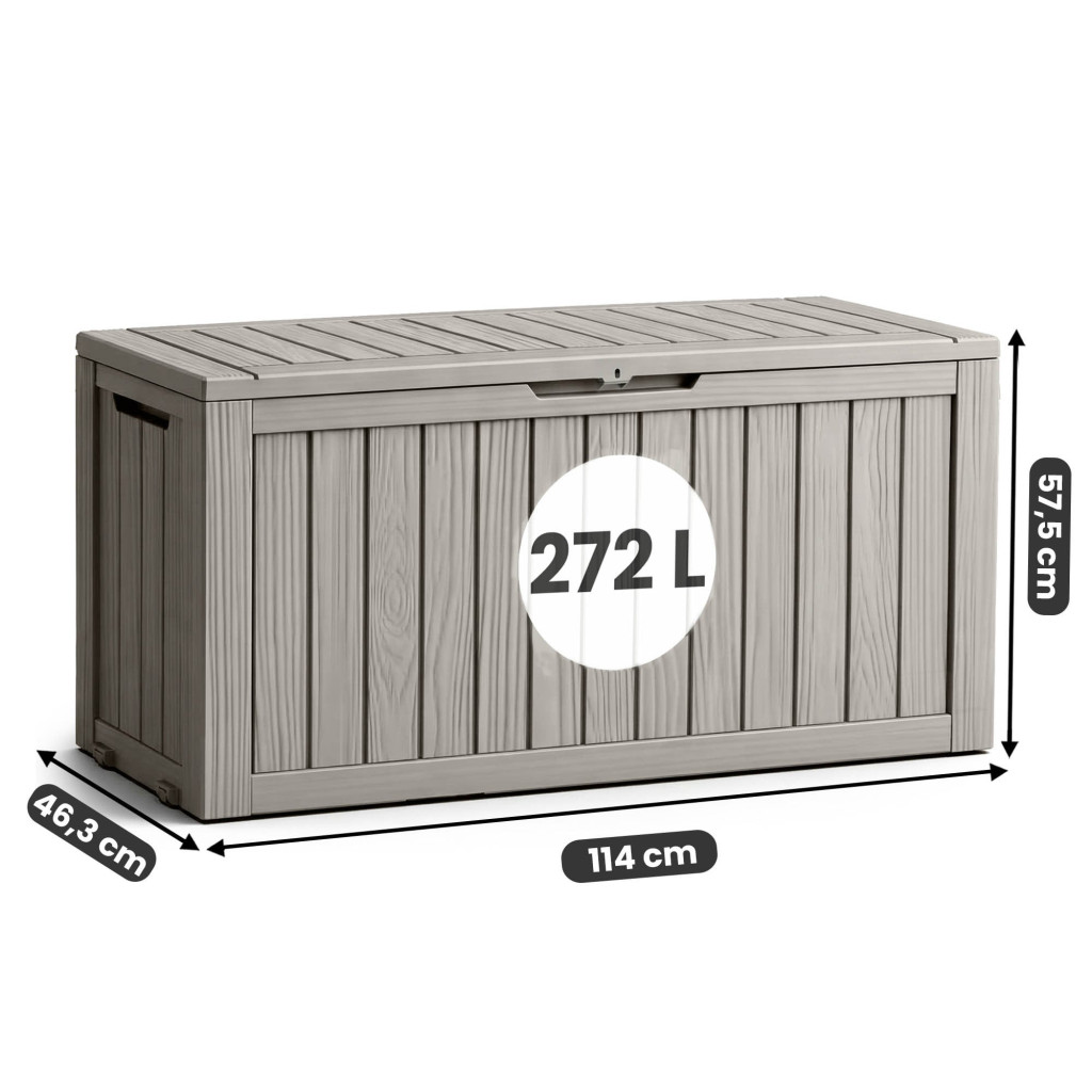 A 272 literes vízálló kerti tároló láda tökéletes megoldás kerti eszközök, párnák és szezonális kellékek rendezett tárolására. Időjárásálló polipropylen anyagból készült, fautánzatú felülettel és UV-szűrővel.