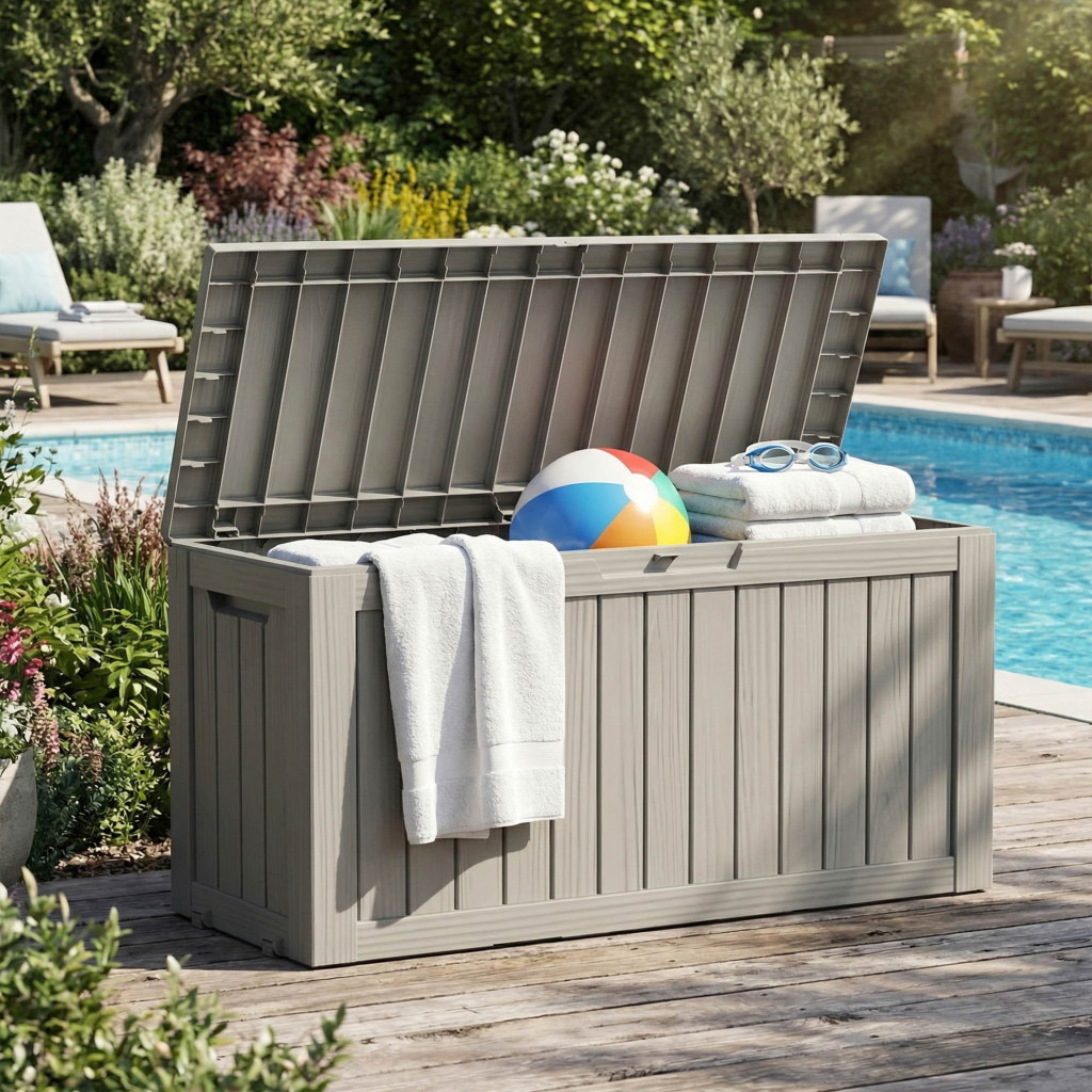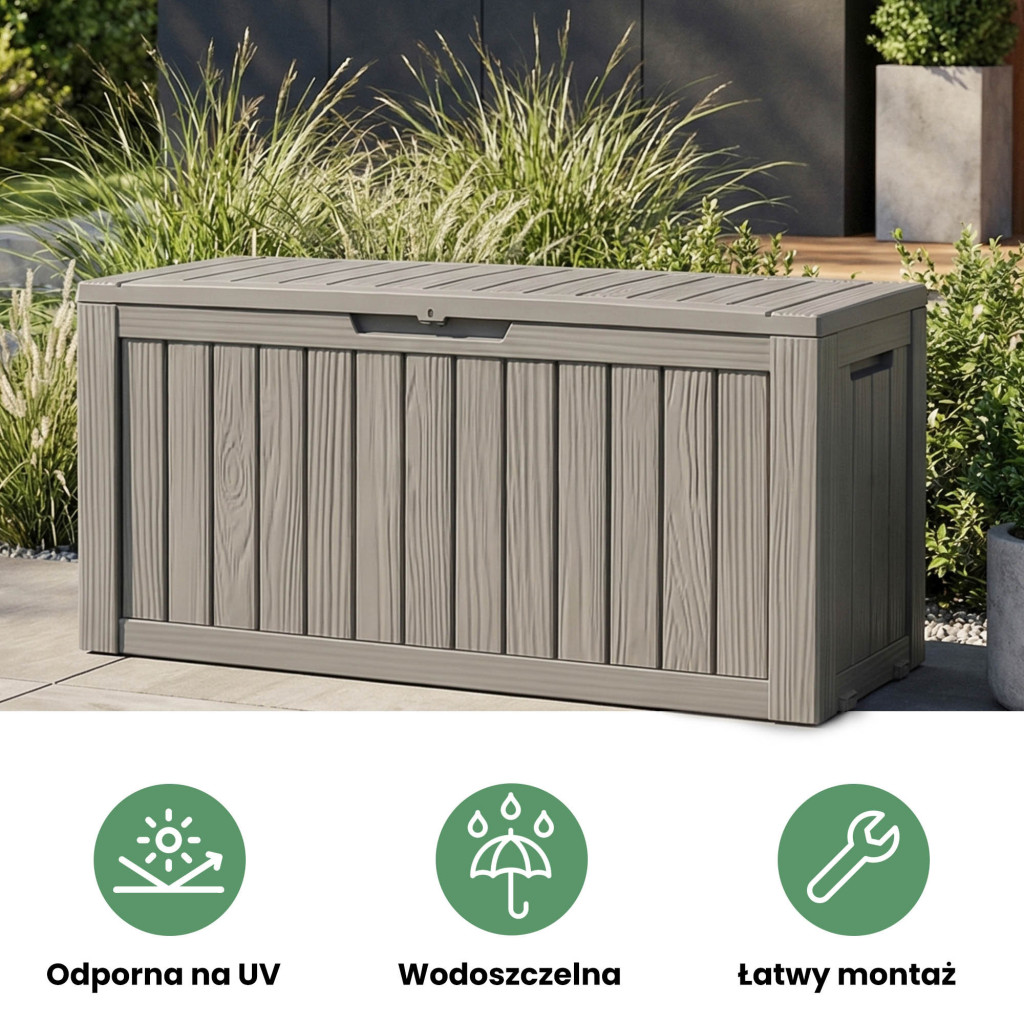 Ez a nagy méretű, 272 literes kerti tároló láda bőséges helyet kínál kerti bútorok párnáinak, kerti szerszámoknak, játékoknak és egyéb szezonális kellékeknek. A láda elegáns szürke színben készült, fautánzatú felülettel, amely harmonikusan illeszkedik bármilyen kerti környezetbe. A vízálló kialakítás és az UV-szűrő védi a tárolt tárgyakat a nedvességtől és a napsugárzástól, így tartalmát biztonságban tudhatja az év minden szakában.