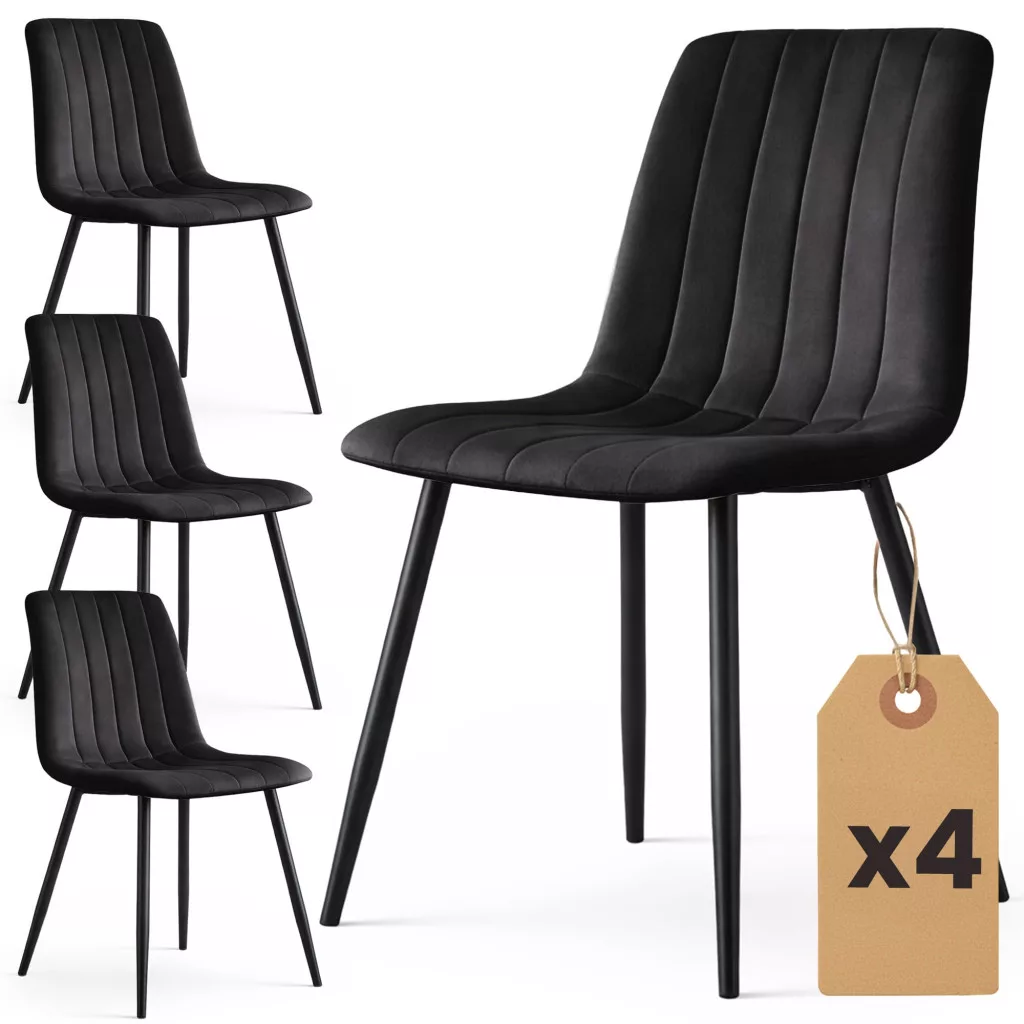Elegáns, fekete welur kárpitozott étkezőszék függőleges steppelt varrással és karcsú fekete acél lábakkal. A 4 darabos szett tökéletes választás modern étkező berendezéséhez.