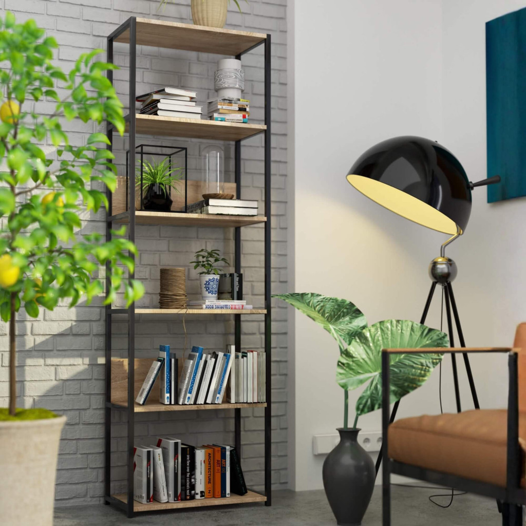Modern industriális stílusú regál fekete fém vázzal és tölgy sonoma színű polcokkal. 6 tágas polc biztosít bőséges tárolóhelyet otthonában vagy irodájában.