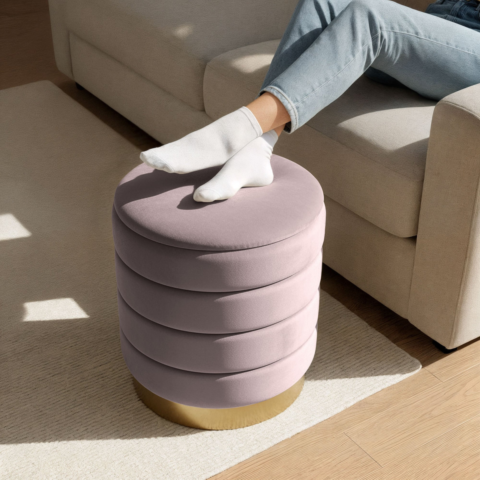 Elegáns, nyitható pufa prémium bársony kárpittal és arany színű alappal, amely praktikus tárolóhelyet kínál, miközben luxus hangulatot teremt otthonában.