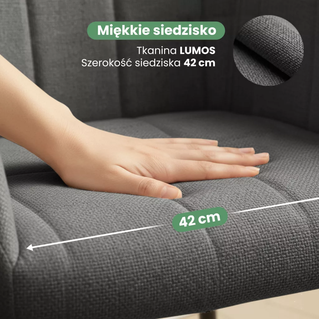 A LUXANO kárpitozott étkezőszék lenyűgöző megjelenésével és kiváló kényelemmel gazdagítja otthonát. A sötét grafitszürke Lumos szövet finom négyzetes steppelése presztízst és kifinomultságot kölcsönöz a bútor számára, míg a nagy sűrűségű habszivacs töltet hosszantartó ülési kényelmet biztosít. A lágy, íves vonalak és a karfás kialakítás modern eleganciát sugároz, amely tökéletesen harmonizál a modern klasszikus, glamour és quiet luxury stílusú terekbe.