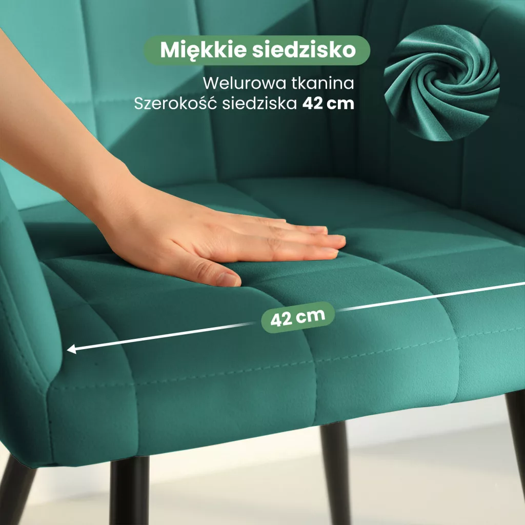 A LUXANO kárpitozott étkezőszék a kifinomult design és a mindennapi kényelem tökéletes ötvözete. A puha welúr kárpitot négyzetes steppelés díszíti, amely presztízst és luxust kölcsönöz a bútor megjelenésének. A nagy sűrűségű habszivacs betét hosszú távú ülési komfortot biztosít, így akár hosszabb vacsorák alatt is kellemes marad a használat. A karfás kialakítás extra támasztást nyújt, míg az egyenes fekete acél lábak stabilitást és modern megjelenést adnak.
