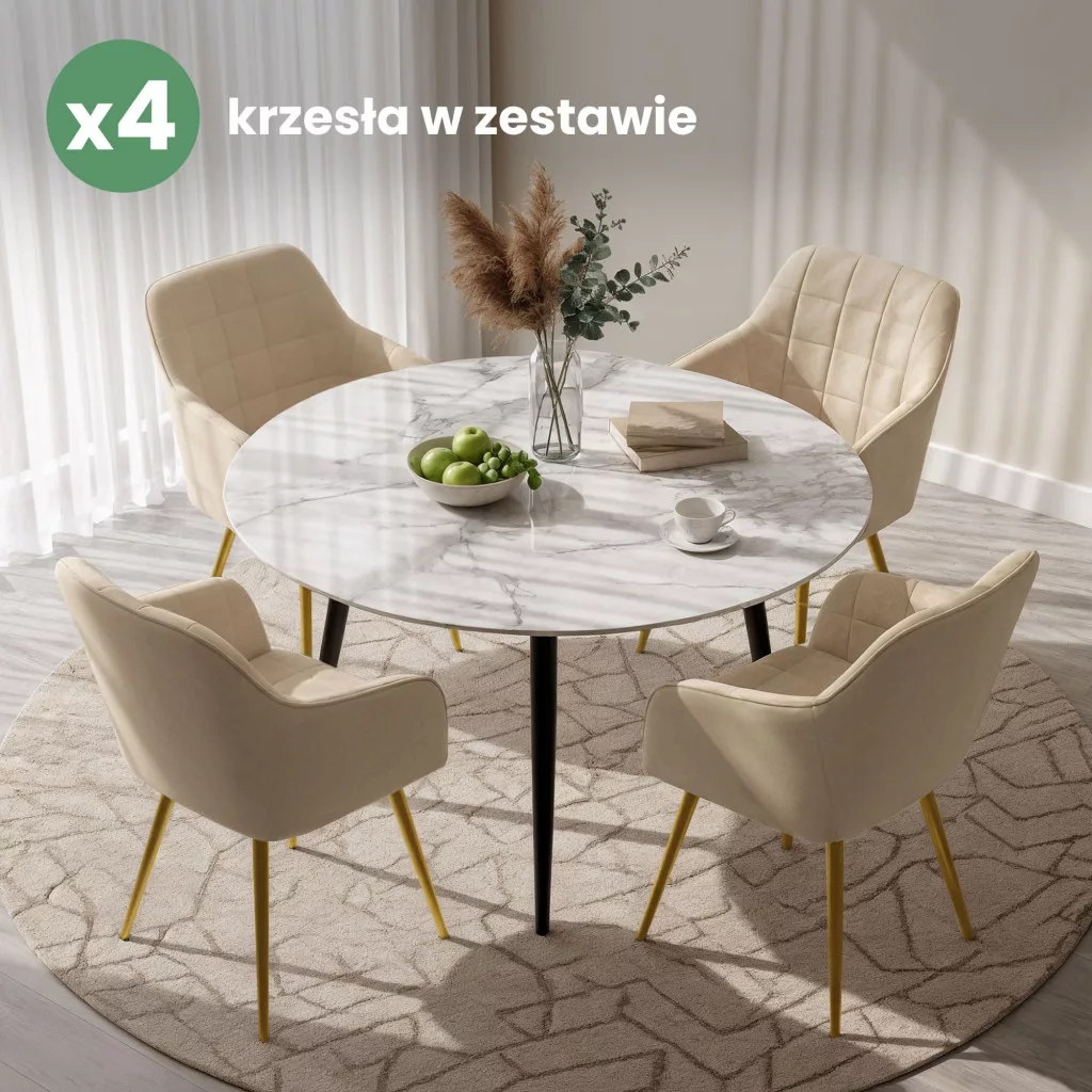 Az arany színű acél lábak stabilitást és vizuális könnyedséget adnak a bútor megjelenésének. A szék 120 kg-os terhelhetőséggel rendelkezik, így tartós és megbízható választás étkezőbe, nappali vagy akár irodai térbe is. A welúr anyag kellemes tapintású és könnyen tisztítható, így praktikus megoldás a mindennapi használatra. A 4 darabos szett egységes, harmonikus enteriőrt teremt.