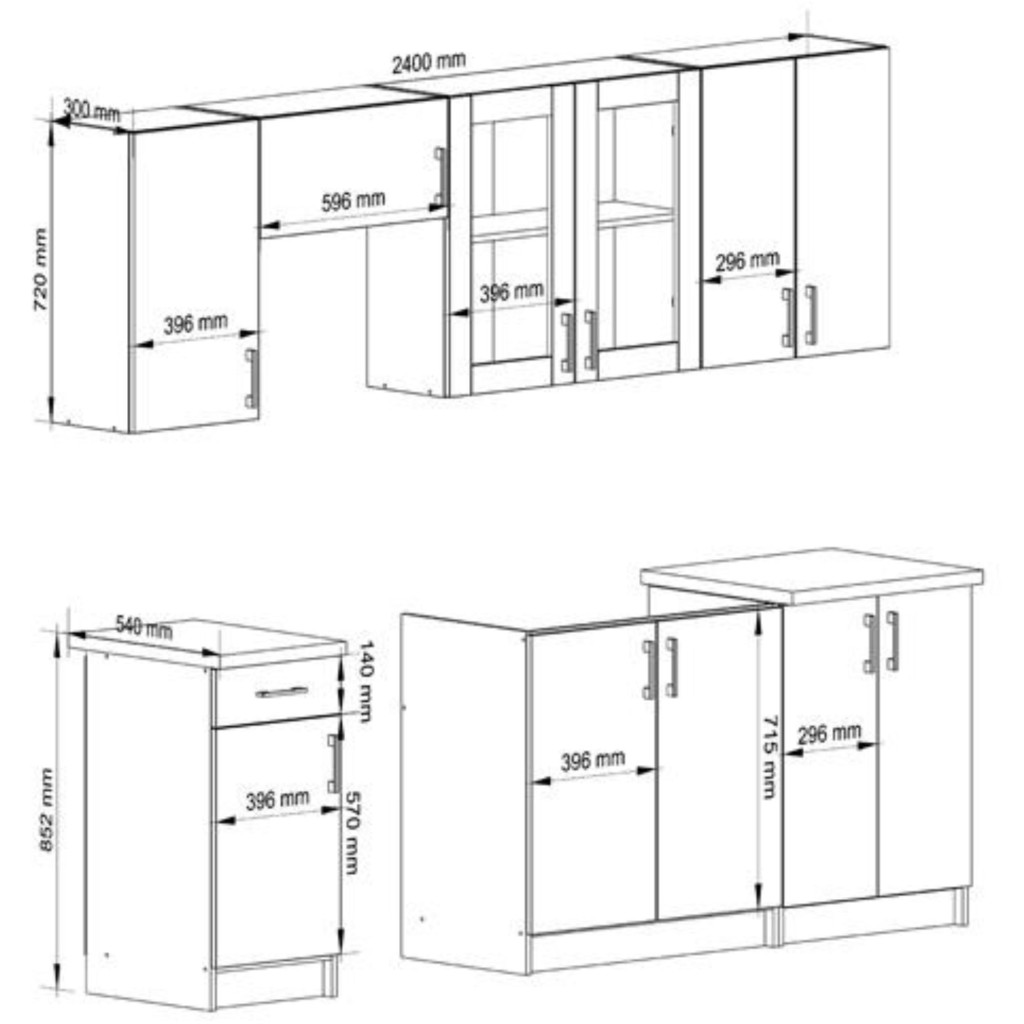 A szett tartalmaz alsó- és felsőszekrényeket, beépített munkalapot, valamint számos tárolási megoldást. A 16 mm vastag laminált bútorlapból készült elemek tartósságot és könnyű tisztíthatóságot garantálnak.