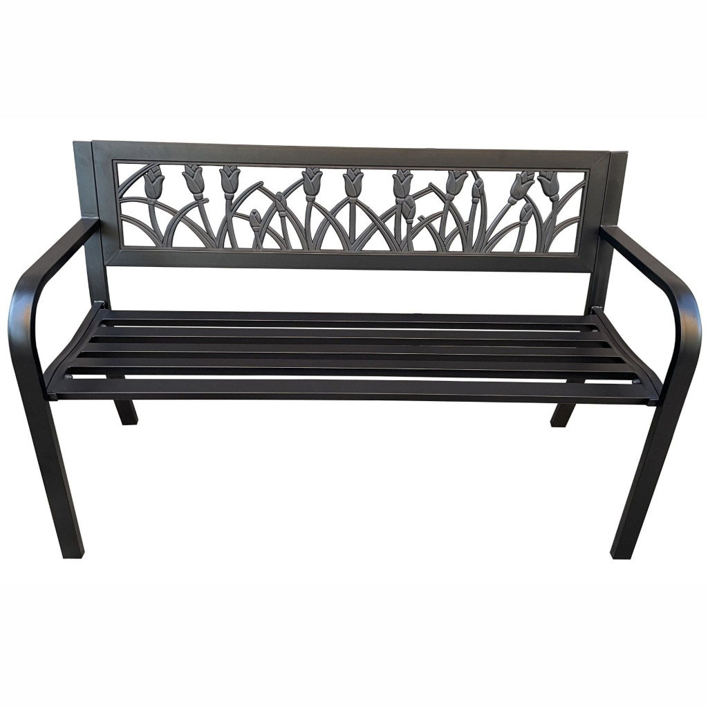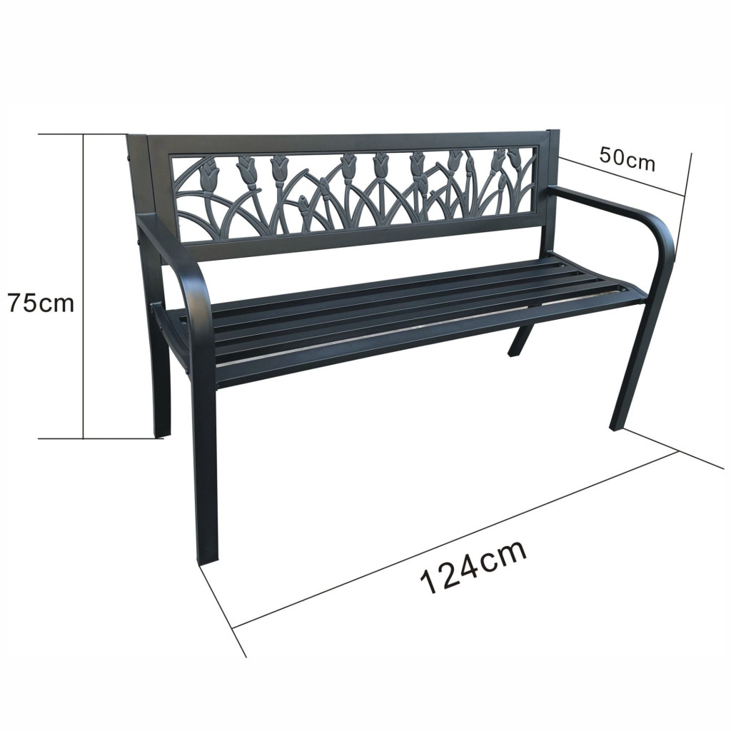 Elegáns, angol stílusú fém kerti pad dekoratív tulipán mintázattal, amely tökéletes választás kertbe, teraszra vagy erkélyre. 320 kg teherbírással és időjárásálló kialakítással rendelkezik.