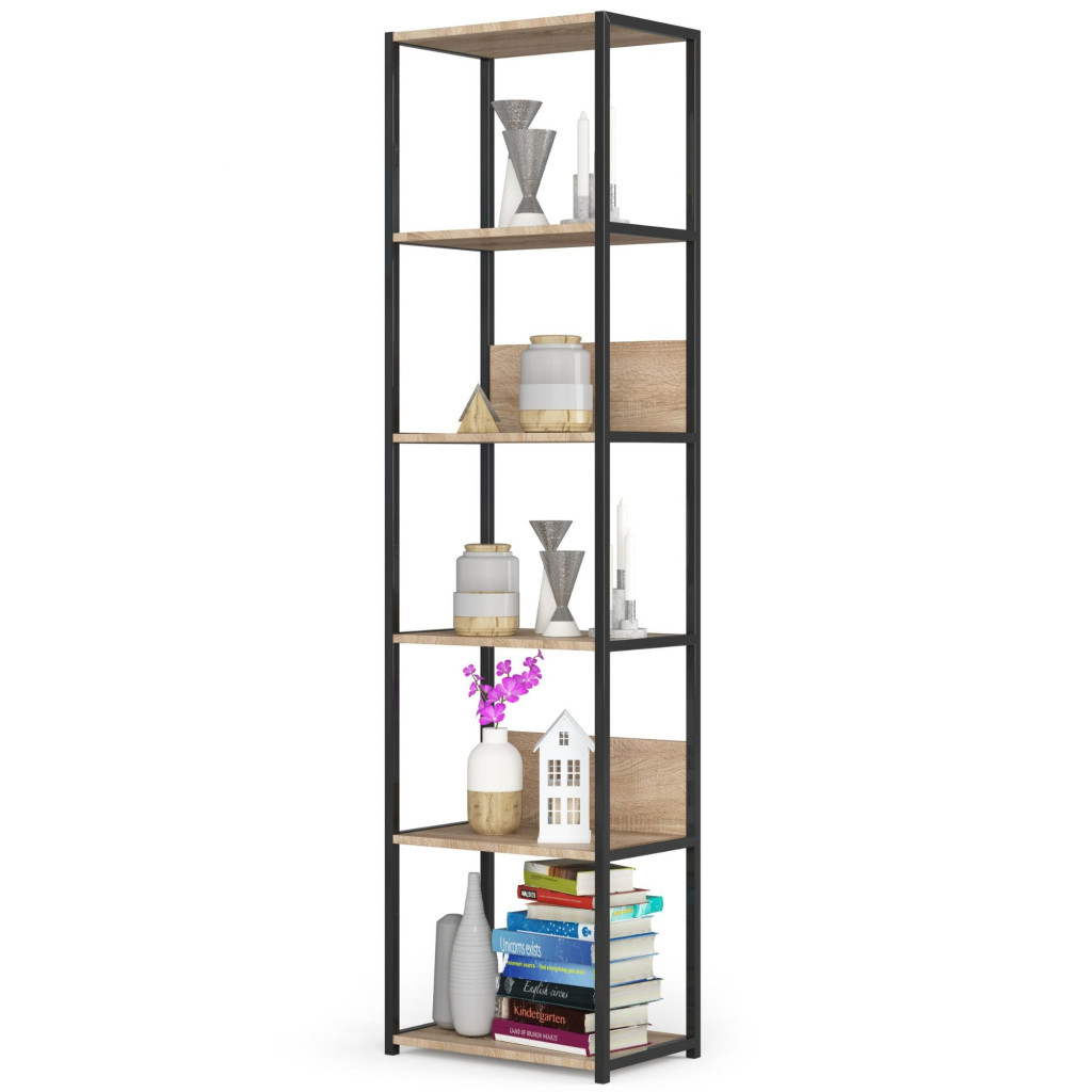 Modern, ipari stílusú polcos állvány 6 tárolószinttel, fekete fém vázzal és Sonoma tölgy polcokkal. Tökéletes választás otthoni vagy irodai tároláshoz.