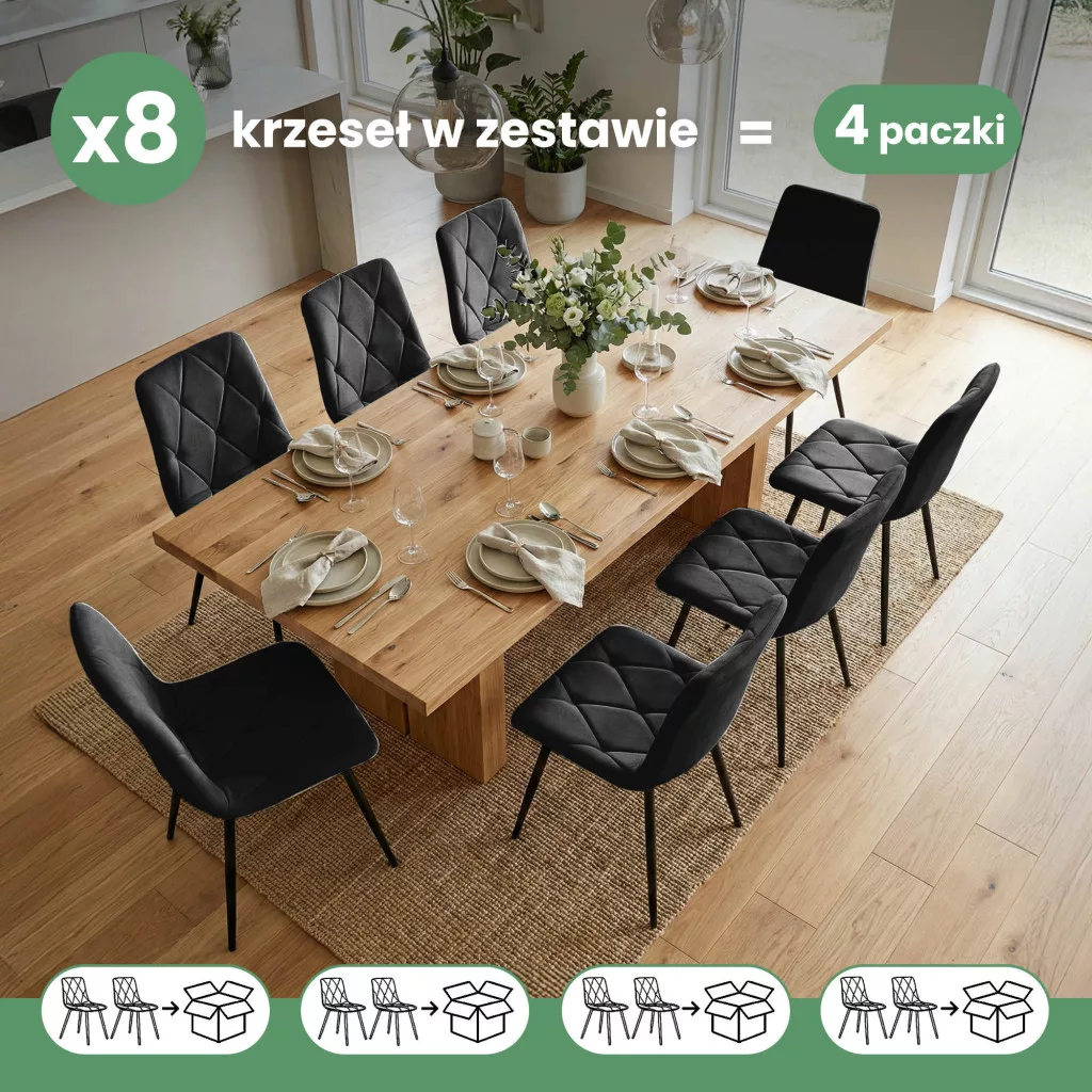Ez a 8 darabos szett ideális megoldás étkezők, nappali terek, ifjúsági szobák vagy irodák berendezéséhez. A MILO szék 130 kg-os teherbírással és 47 cm-es ülésmagassággal biztosítja a kényelmet és a stabilitást. A welúr anyag nemcsak esztétikus, hanem kellemes tapintású is, így minden étkezés vagy munka élménnyé válik. Válassza a MILO széket, és teremtsen stílusos, barátságos légkört otthonában!