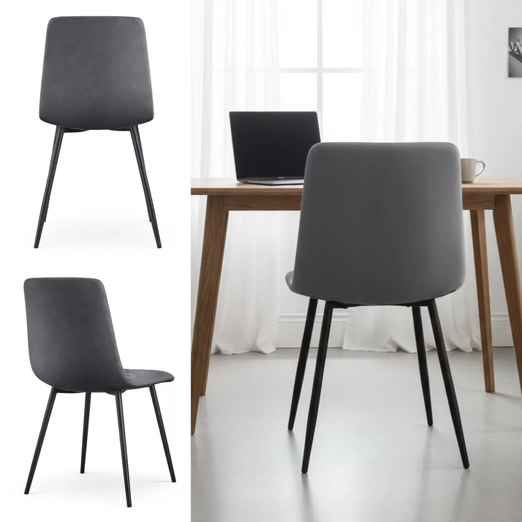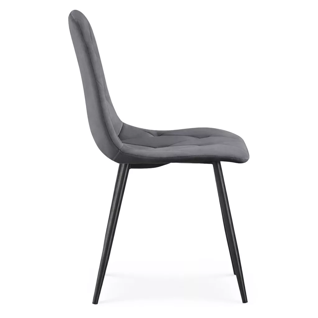 A MILO kárpitozott étkezőszék a modern elegancia és a praktikus kényelem tökéletes ötvözete. A sötét grafitszürke welur kárpit puha tapintású felületet biztosít, míg a jellegzetes rombusz steppelés kifinomult, luxus megjelenést kölcsönöz. A szék könnyű, mégis stabil fekete acél lábakkal rendelkezik, amelyek harmonikusan illeszkednek a modern, modern classic és modern glamour stílusú enteriőrökbe. Az ergonomikus kialakítás hosszú órákon át tartó kényelmet nyújt, legyen szó étkezésről, munkáról vagy pihenésről.