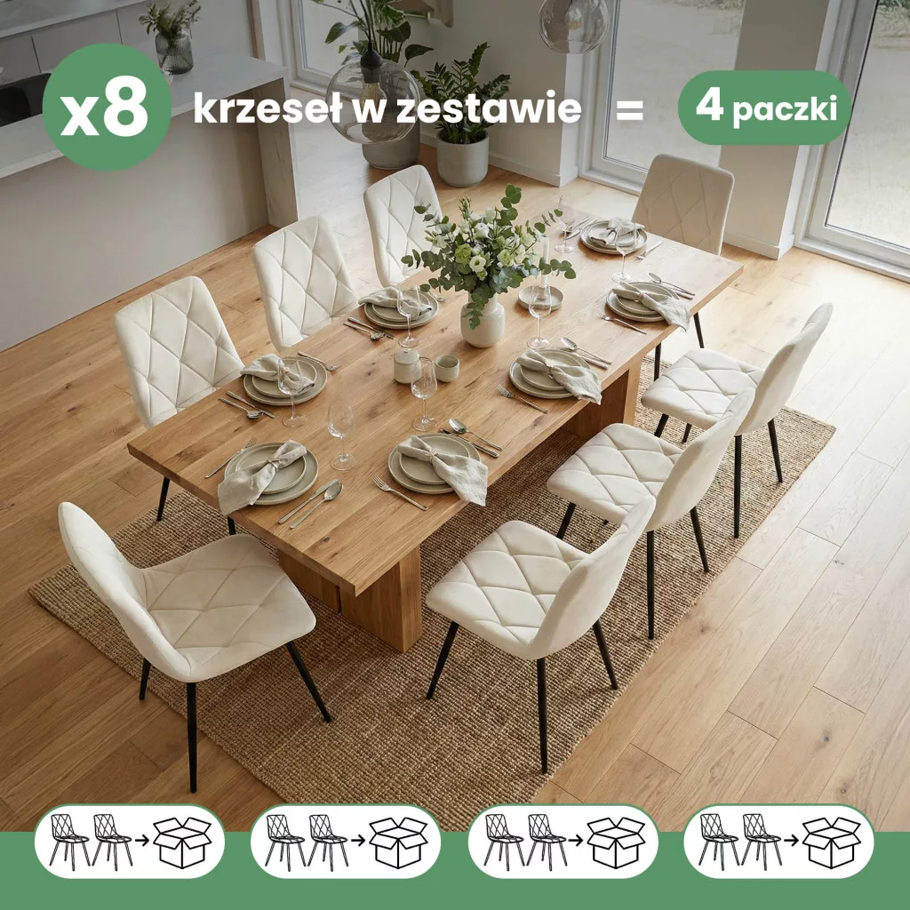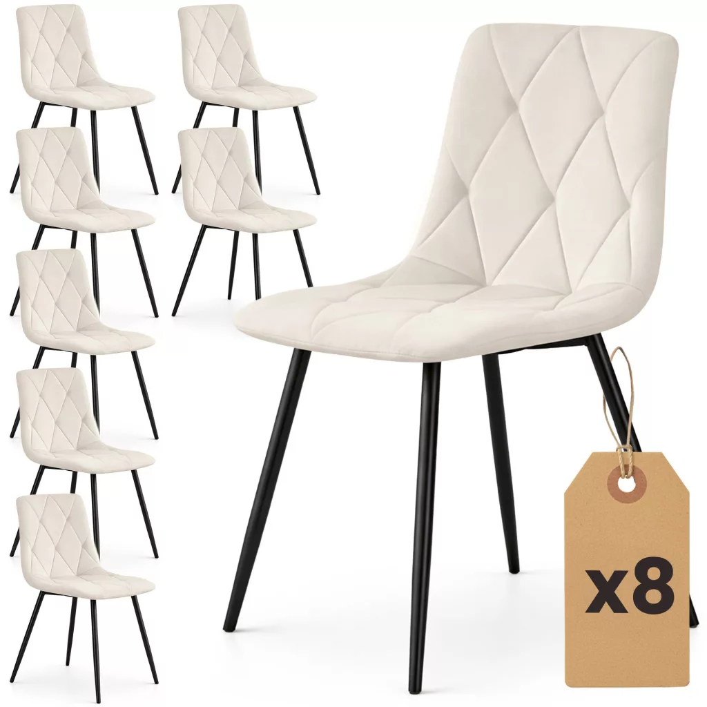 Az elegáns MILO étkezőszék welur kárpittal és rombusz steppelt mintával modern eleganciát kölcsönöz otthonának. A puha, bézs színű ülőfelület és a karcsú fekete fém lábak tökéletes harmóniája 8 darabos szettben.