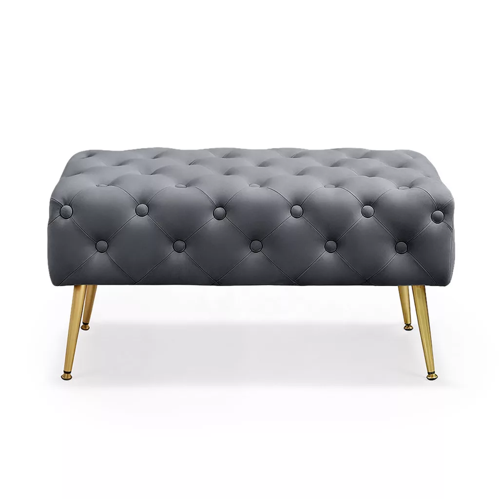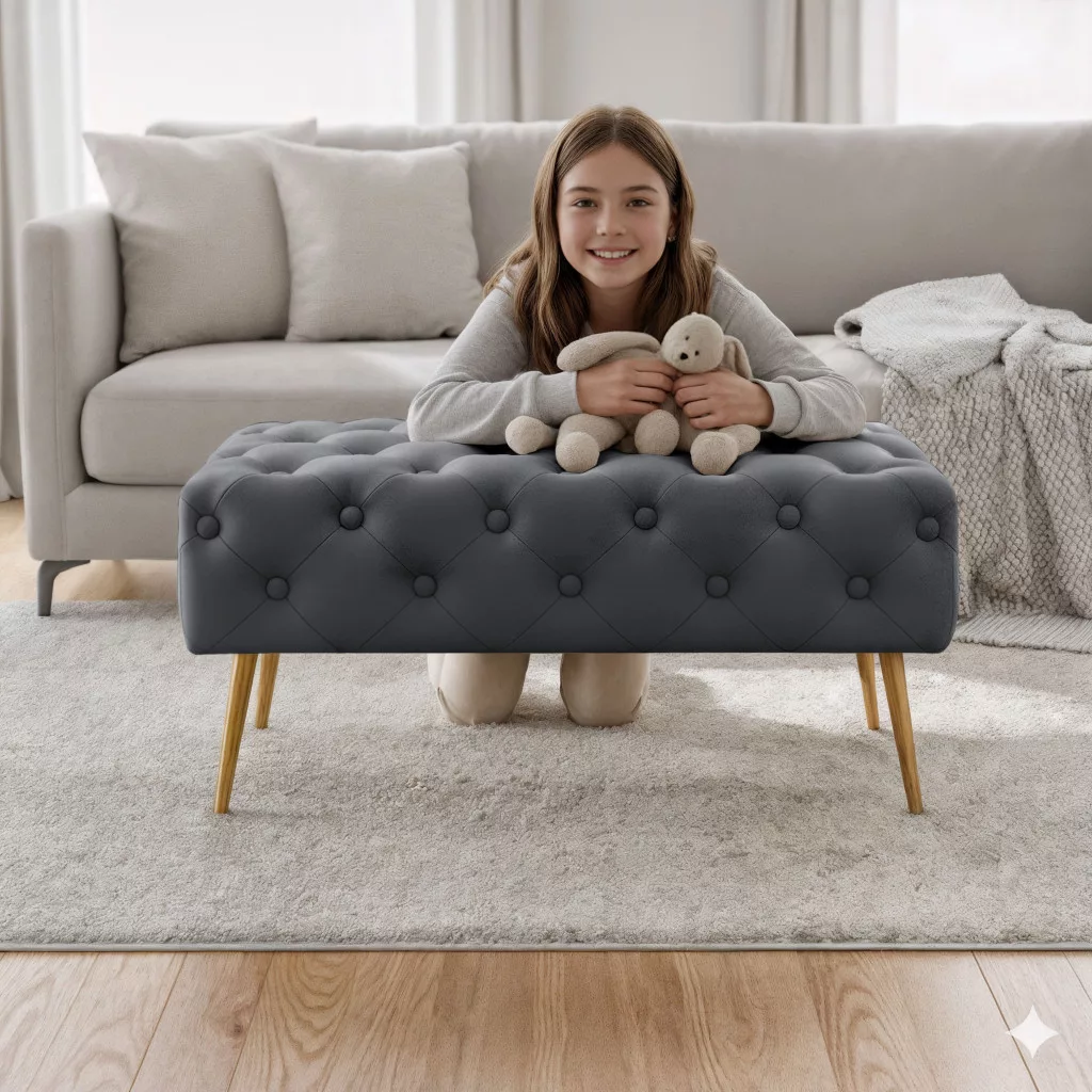 A Madrid pufa elegáns glamour stílusú ülőbútor, amely pikírozott grafitszürke bársony kárpittal és arany színű fém lábakkal díszíti otthonát. Tökéletes választás azok számára, aki luxust és kifinomultságot keresnek nappalijukba, hálószobájukba vagy előszobájukba.