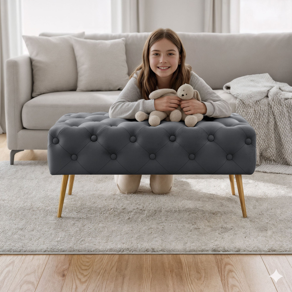 A Madrid pufa elegáns, glamour stílusú ülőbútor, amely pikírozott grafitszürke bársony kárpittal és arany színű fém lábakkal díszíti otthonát. Tökéletes választás azok számára, aki kifinomult designt és kényelmet keresnek.