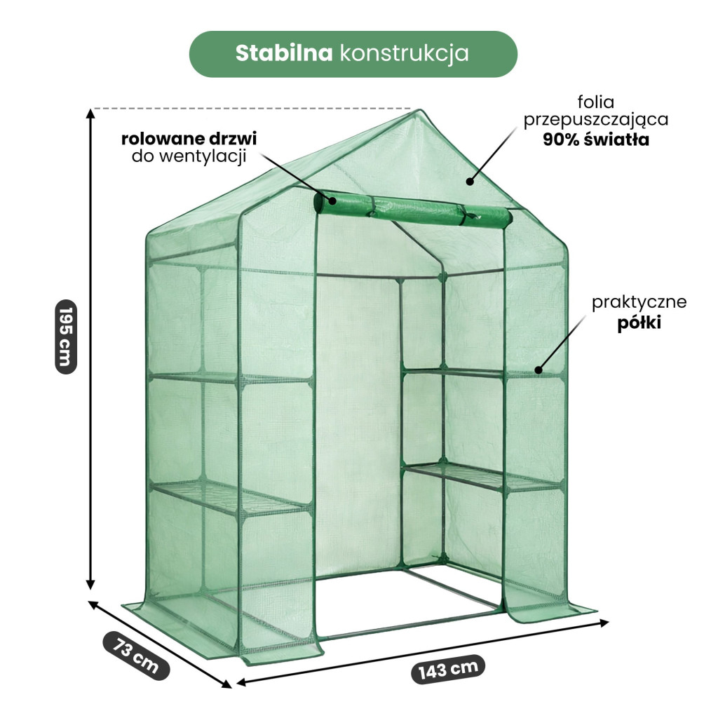 Az AKORD mini fóliaház tökéletes megoldás azok számára, akik saját üvegházról álmodnak, de korlátozott kertterülettel rendelkeznek. A 143x73x195 cm-es kompakt méret ellenére a többszintes polcrendszernek köszönhetően meglepően sok növény elhelyezésére alkalmas. A porral bevont acél váz stabilitást biztosít, míg az UV-szűrős PE fólia megbízható védelmet nyújt az időjárás viszontagságai ellen.