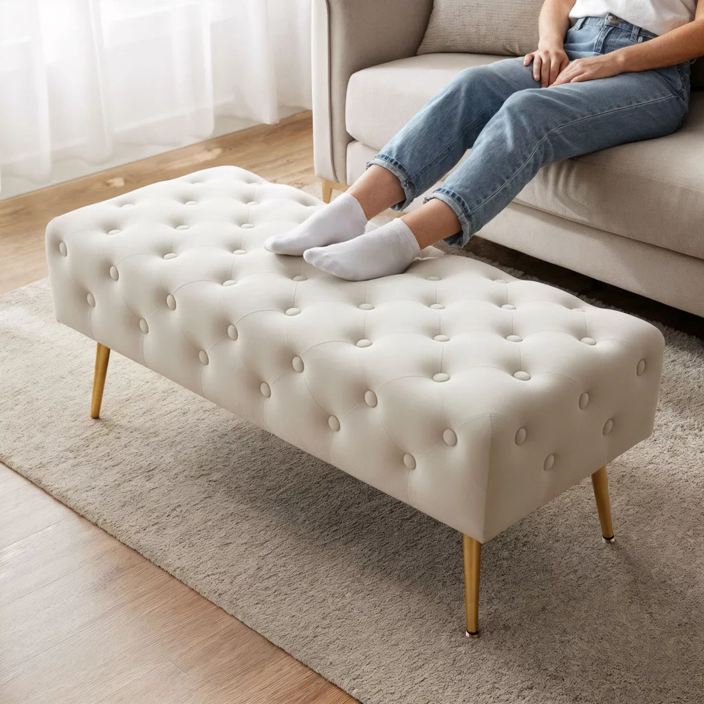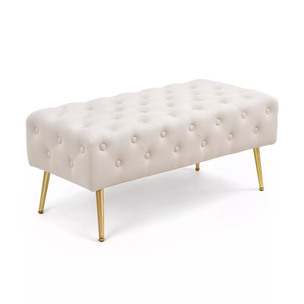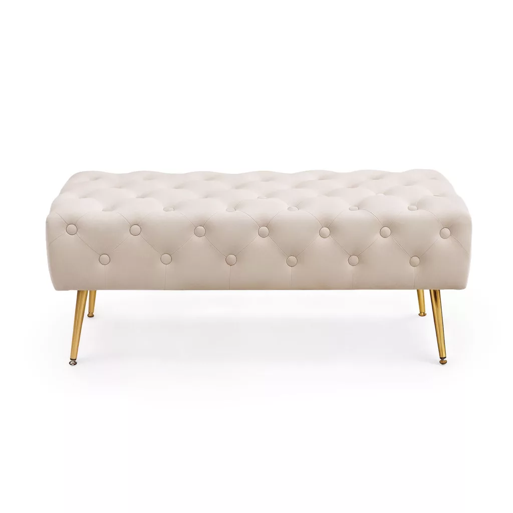 Elegancka tapicerowana ławka Monaco w beżowym welurze z pikowanym wykończeniem i złotymi nogami. Idealna do przedpokoju lub sypialni, pomieści dwie osoby i wytrzyma obciążenie do 200 kg.