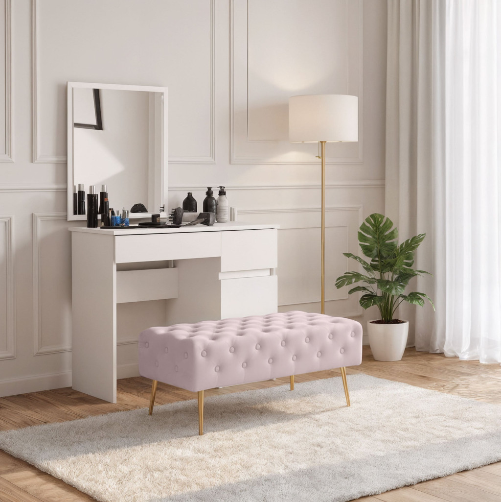 Ławka tapicerowana Monaco w delikatnym, pudrowym różu to kwintesencja eleganckiego designu i funkcjonalności. Wykonana z miękkiego weluru z charakterystycznym pikowaniem ozdobiona dekoracyjnymi guziczkami, stanowi efektowny akcent w każdym pomieszczeniu. Złote, stalowe nogi dodają produktowi ekskluzywnego charakteru w stylu glamour, idealnie komponując się z nowoczesnymi i klasycznymi aranżacjami.