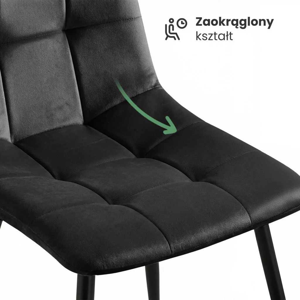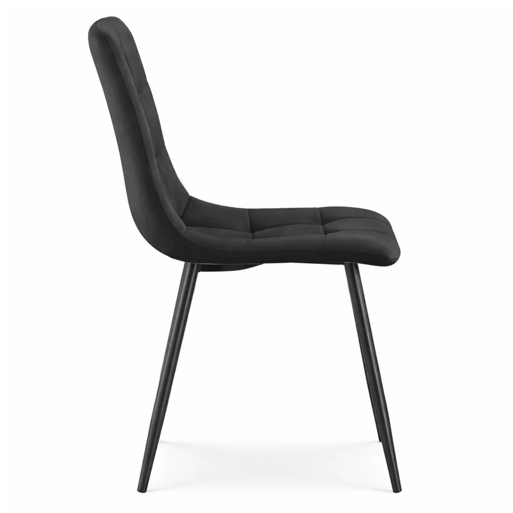 Elegáns fekete welúr étkezőszékek 6 db-os szettben, négyzetes pikírozással és karcsú fekete fém lábakkal. Tökéletes választás modern, loft és skandináv stílusú étkező berendezéséhez.