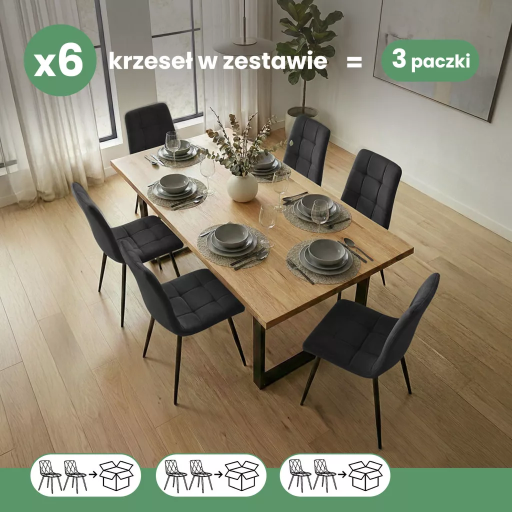 A 6 db-os szett praktikus megoldást kínál családok és vendégszerető háztartások számára. A 130 kg-os teherbírás és a minőségi kivitelezés hosszú élettartamot garantál. A welúr anyag kellemes tapintású, könnyen tisztítható, míg a stabil fémváz biztosítja a mindennapi használat során szükséges tartósságot. Legyen szó étkezőről, irodáról vagy ifjúsági szobáról, ez a székszett minden térben megállja a helyét.