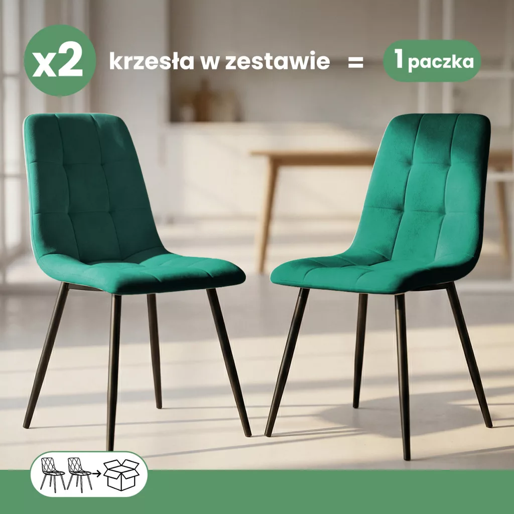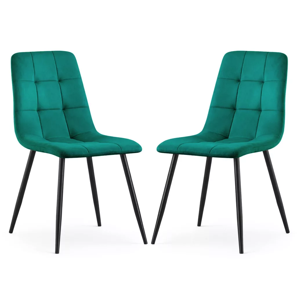 Elegáns welur kárpitozott étkezőszék palackzöld színben, négyzet mintás steppelt felülettel és karcsú fekete fém lábakkal. Tökéletes választás modern, loft és skandináv stílusú étkező berendezéséhez.