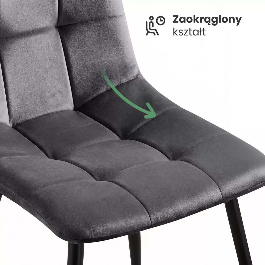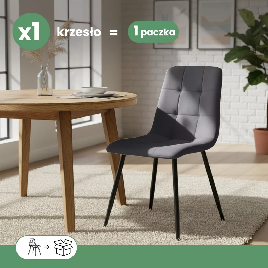 A NERO étkezőszék loft stílusú megjelenése azonnal feldobja bármely tér hangulatát. A sötétszürke welúr kárpit négyzetes steppelése nemcsak vizuálisan vonzó, de kellemes tapintású felületet is biztosít. A karcsú, fekete fém lábak stabilitást és modern karaktert kölcsönöznek a széknek, miközben kompakt mérete révén kisebb étkező vagy dolgozószobákban is tökéletesen elhelyezhető.