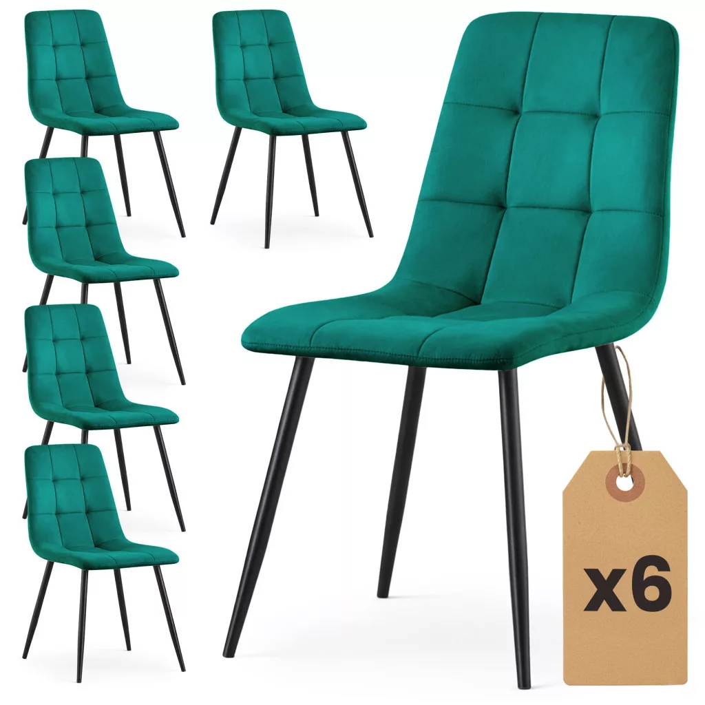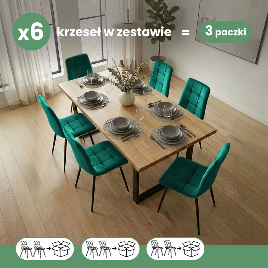 Elegancki zestaw 6 welurowych krzeseł NERO z efektownym pikowaniem w kwadraty i smukłymi czarnymi metalowymi nogami. Idealne do nowoczesnych i industrialnych wnętrz, łączące styl z wygodą.