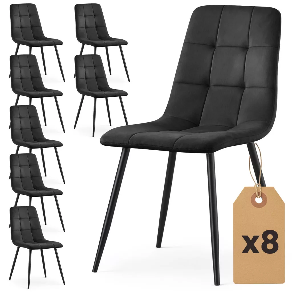 Elegáns, fekete welur kárpitozott étkezőszék négyzetes pikírozással és karcsú fém lábakkal. Tökéletes választás modern, loft, skandináv vagy minimalista stílusú étkező berendezéséhez.