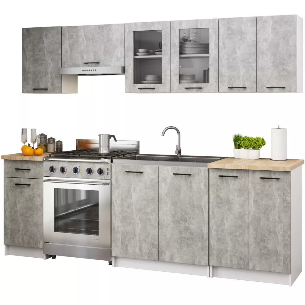 AKORD Oliwia 2.4m Konyhabútor Szett Beton Színben Üvegvitrines Szekrénnyel