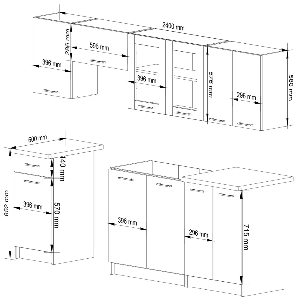 Modern, kompakt konyhabútor szett 2.4 méteres kivitelben, üvegvitrines felsőszekrénnyel és sonoma tölgy munkalappal. Ideális választás kis konyhákba és konyhasarkokba.