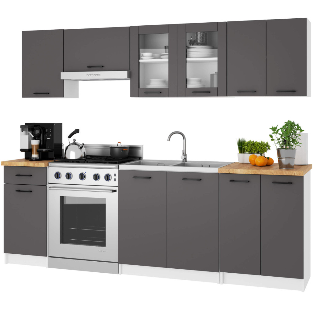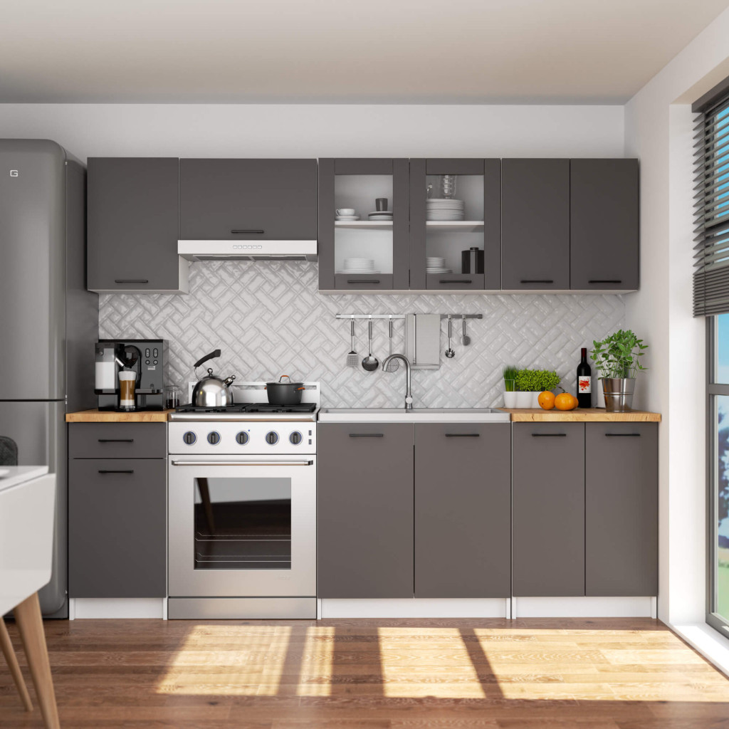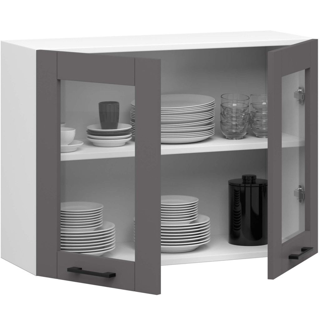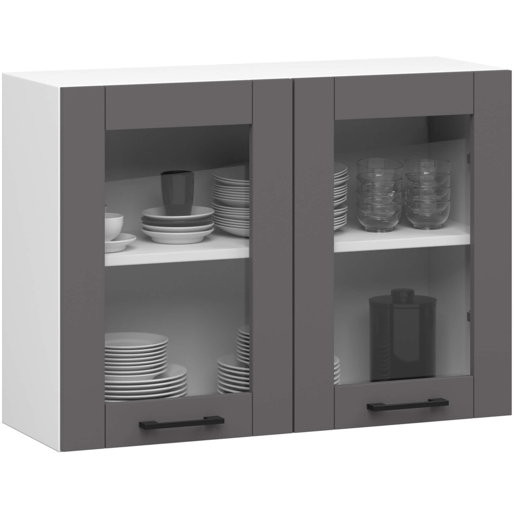Modern, kétajtós fali vitrines konyhaszekrény fehér korpusszal és elegáns szürke matt frontokkal, két praktikus polccal az optimális tárolásért.