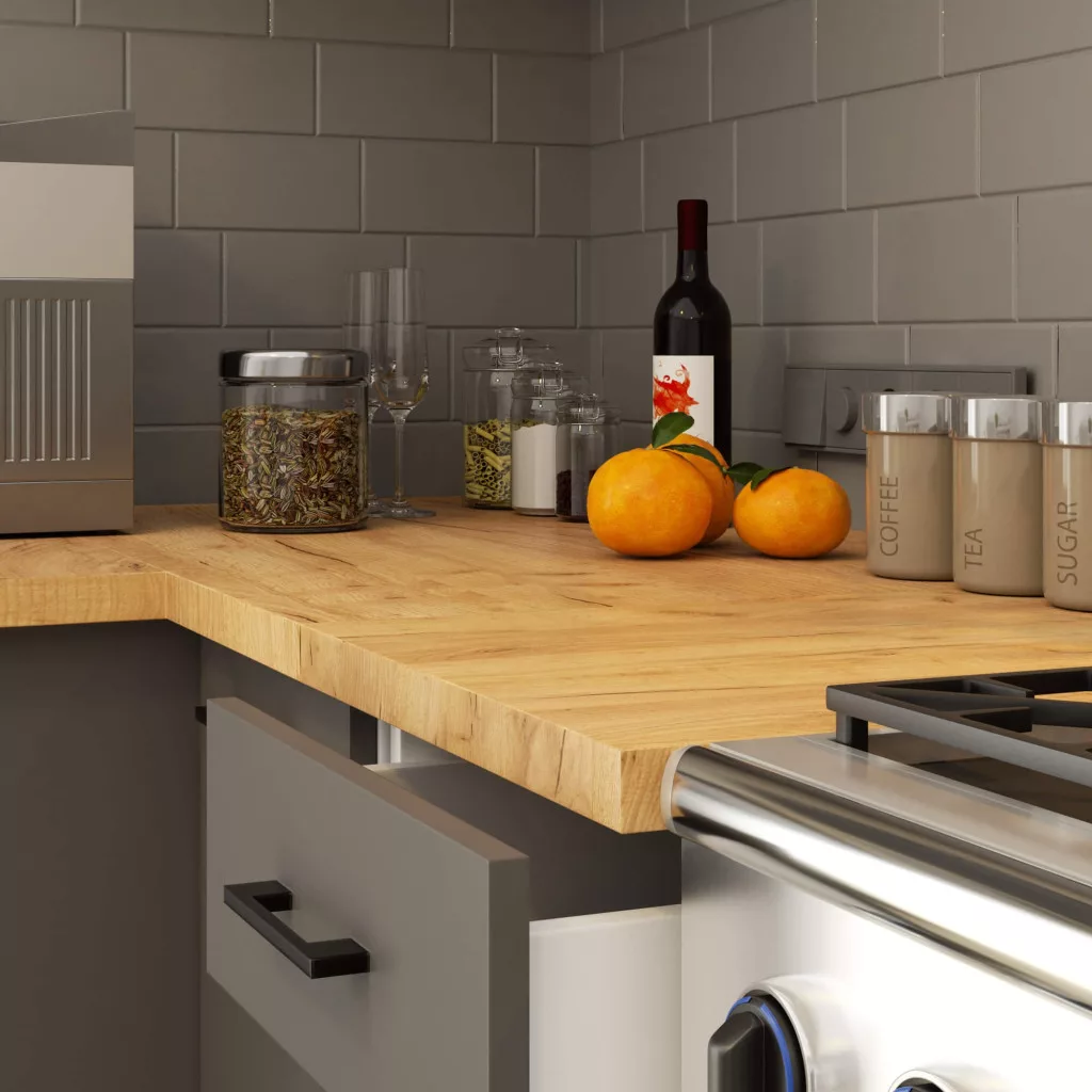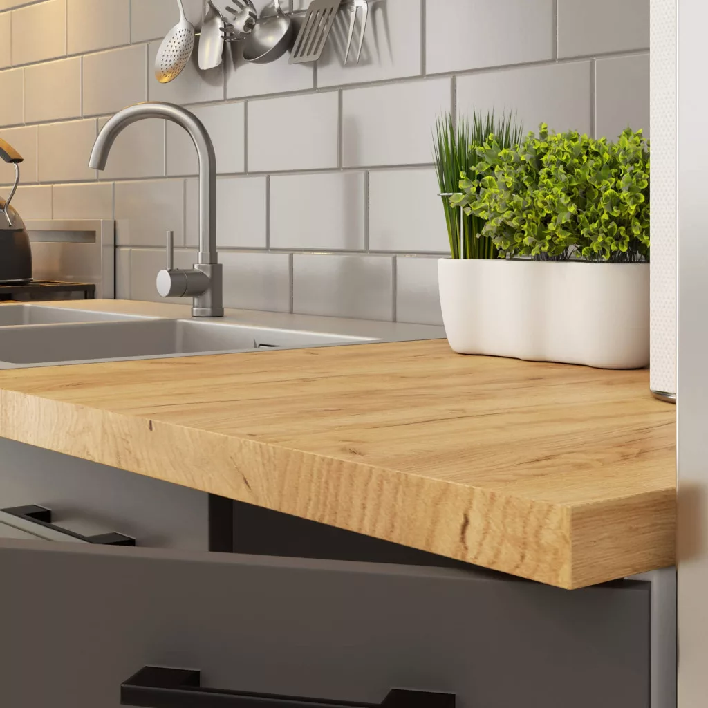 Strapabíró, 32 mm vastag laminált munkalap az Oliwia konyhabútor családhoz, természetes tölgy mintázattal.