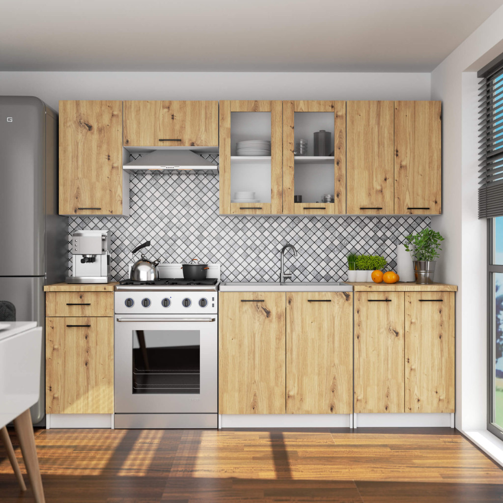 Modern, kétajtós üveges felsőszekrény fehér korpusszal és artisan tölgy fronttal, ideális konyhai tárolási megoldás edények és étkészletek számára.