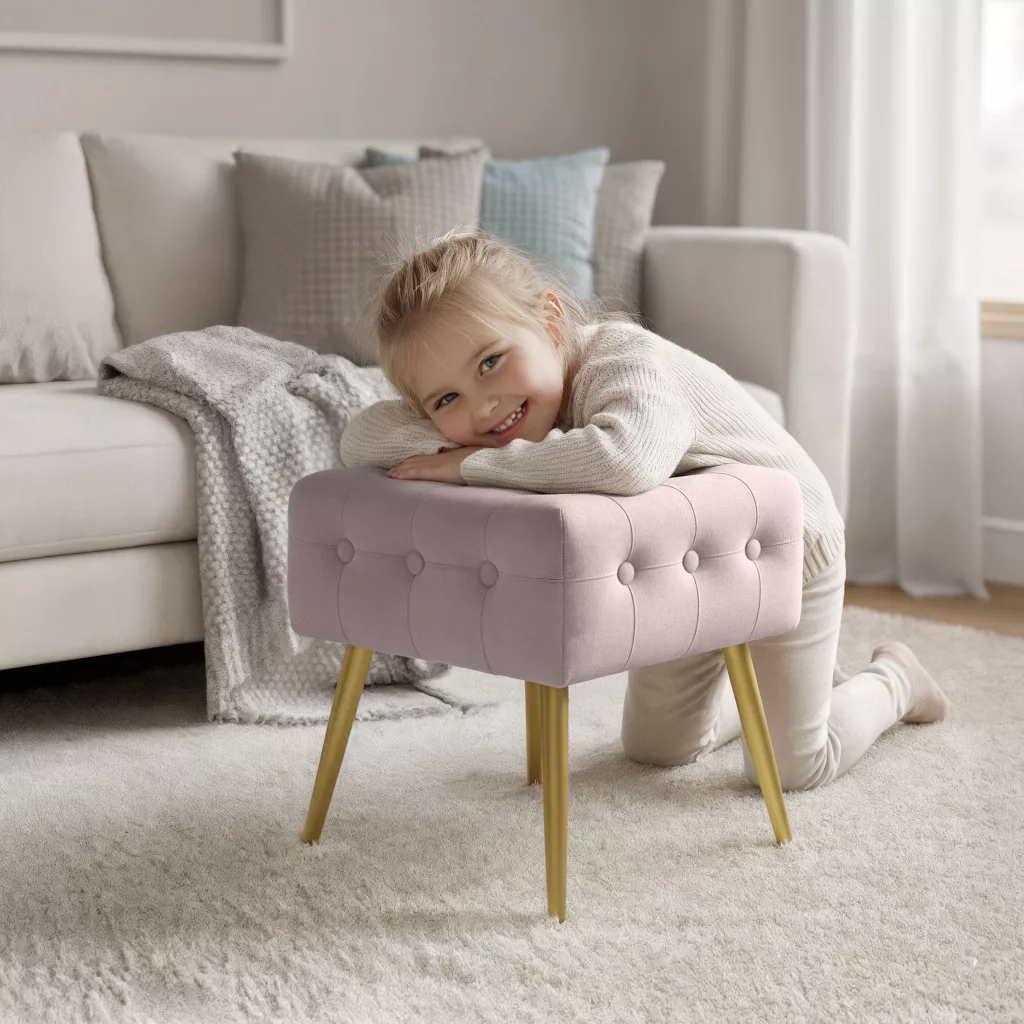 A QUADRA pufa egy stílusos és praktikus bútordarab, amely tökéletesen illeszkedik kisebb helyiségekbe, legyen az előszoba, hálószoba, nappali vagy tinédzser szoba. Puha, bársonyos welur kárpitja dekoratív gombokkal díszített steppelt felülettel rendelkezik, amely luxus megjelenést kölcsönöz a búторnak. Az arany színű fém lábak kifinomult kontrasztot teremtenek a púderrózsaszín kárpittal, így a pufa igazi ékszerré válik bármely enteriőrben.