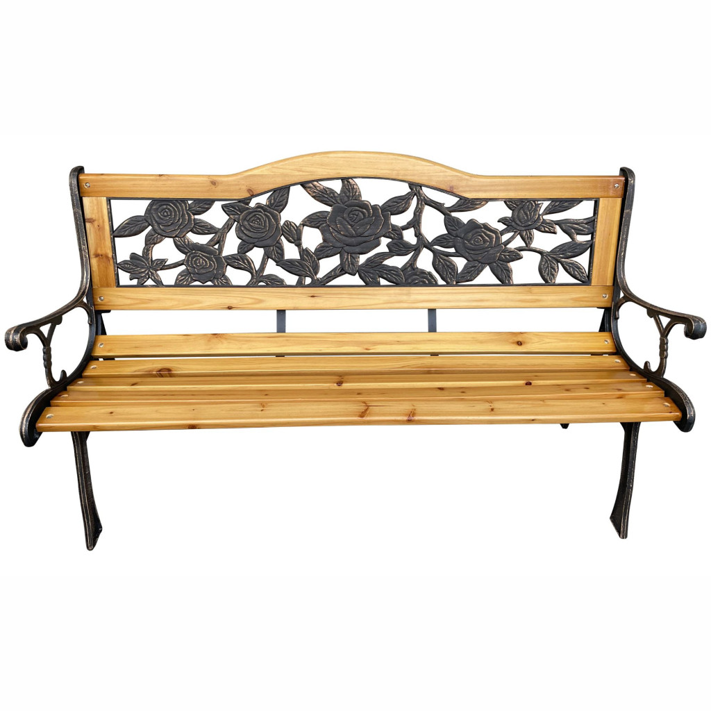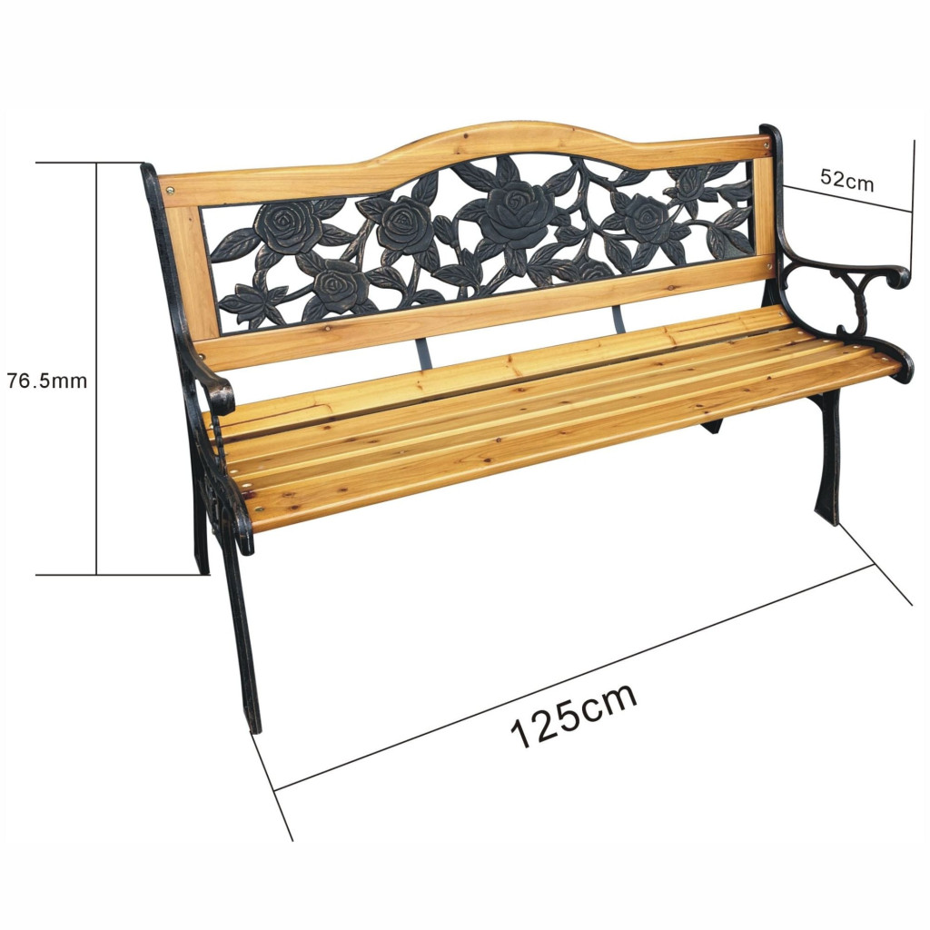 Elegáns, rózsamintás kerti pad természetes fából és öntöttvasból, amely tökéletes választás kertjébe vagy teraszára. A 125 cm széles pad akár 260 kg terhelhetőséggel rendelkezik.