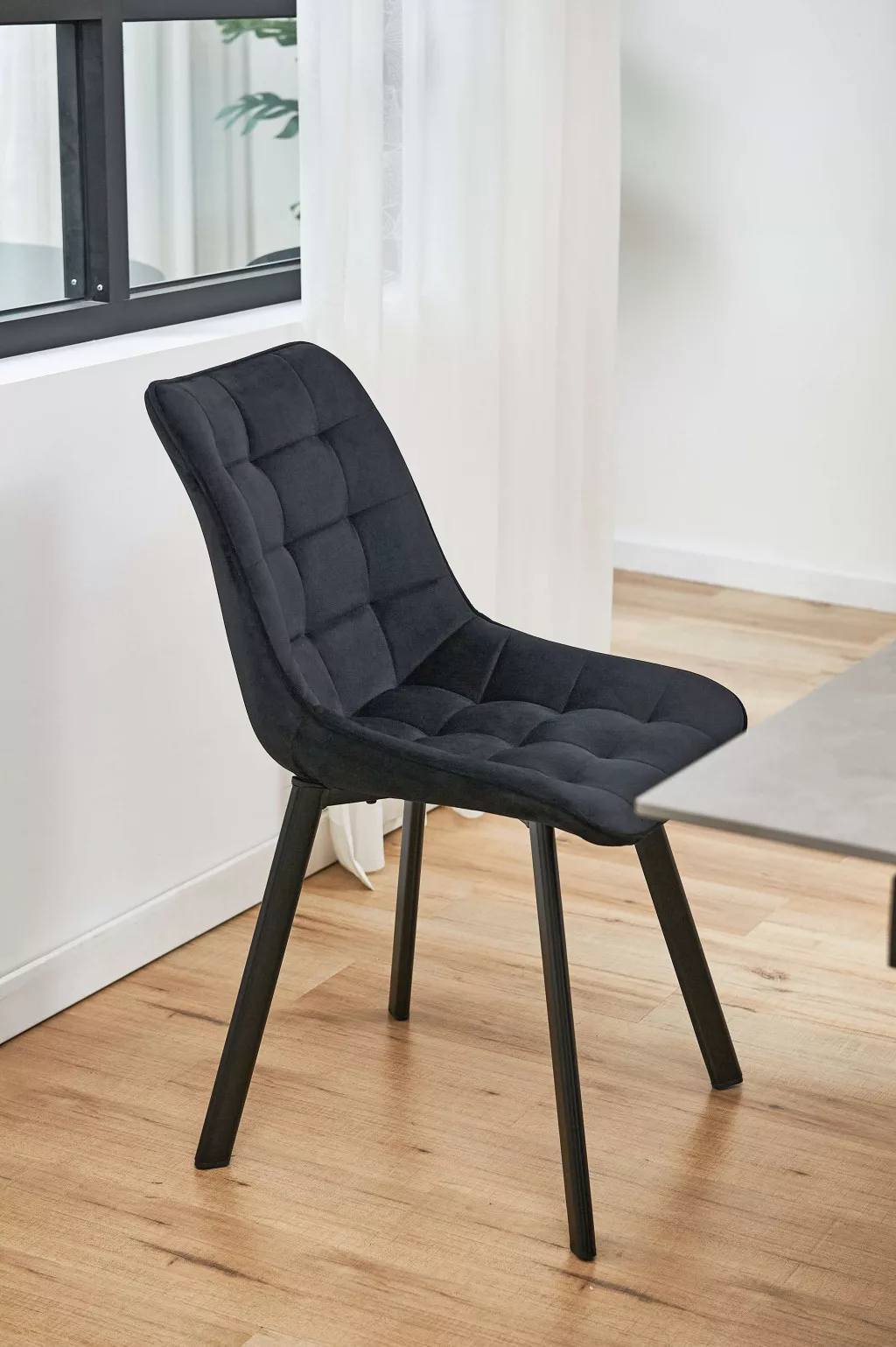 Elegáns, steppelt kialakítású velúr étkezőszék fekete acél lábakkal, amely tökéletes választás modern és klasszikus enteriőrökbe egyaránt.
