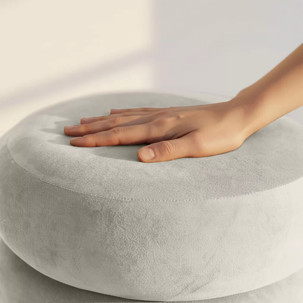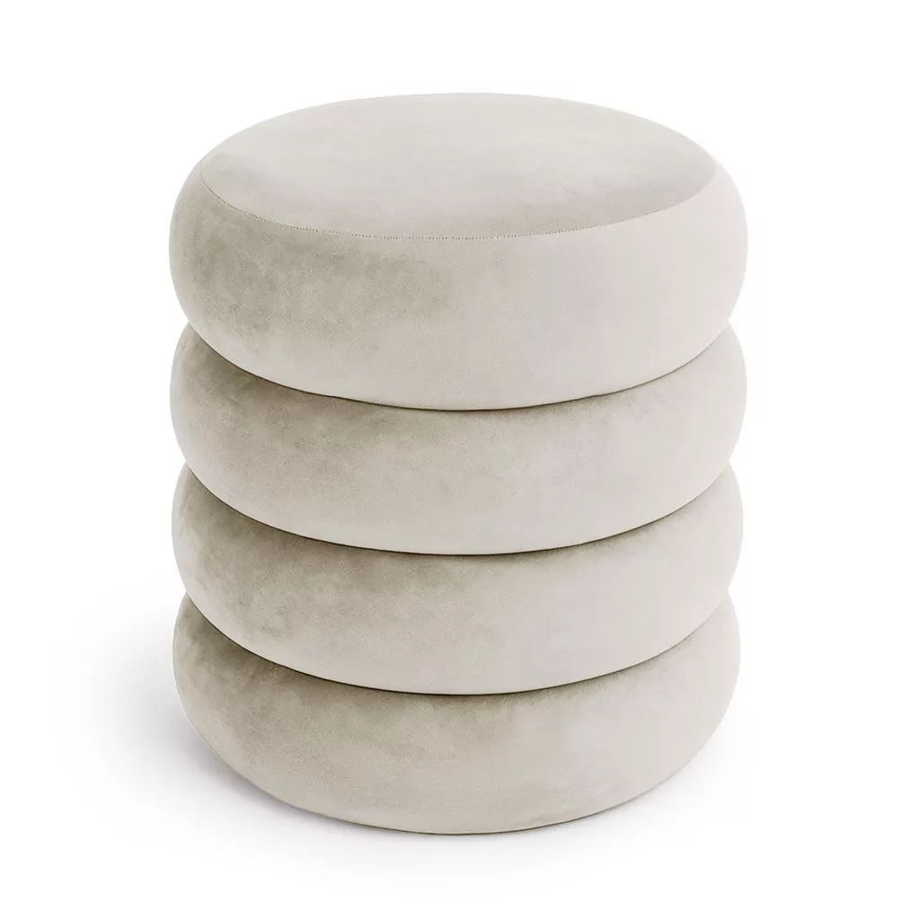 A SNUGGO pufa lenyűgöző, hengeres formájával és egyedi, rétegzett designjával azonnal magára vonja a figyelmet. A 42 cm átmérőjű, kompakt méretének köszönhetően bármely helyiségbe könnyen beilleszthető, miközben az ülőfelület alatt rejtett tárolórekeszt kínál. A krémszínű bársony kárpit luxus érzetet és kifinomult eleganciát kölcsönöz a búторnak, amely tökéletesen illeszkedik a modern soft glam és organic modern stílusú belső terekbe.