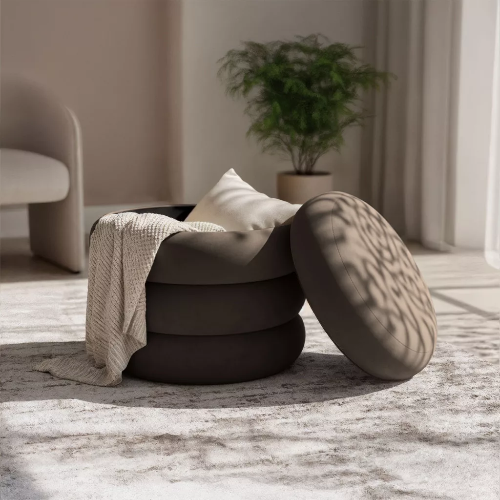 A puff igazi különlegessége a felnyitható ülőfelület alatt rejtőző tárolórekesz, amely praktikus megoldást kínál apróságok, takarók vagy magazinok rendezett elhelyezésére. A strapabíró fa és MDF alapszerkezet 100 kg-ig terhelhetőséget biztosít, így nemcsak dekoratív elem, hanem megbízható ülőbútor is. A barna welur változat kifinomult eleganciát kölcsönöz az enteriőrnek, miközben a puha textúra otthonos, meghitt hangulatot teremt.