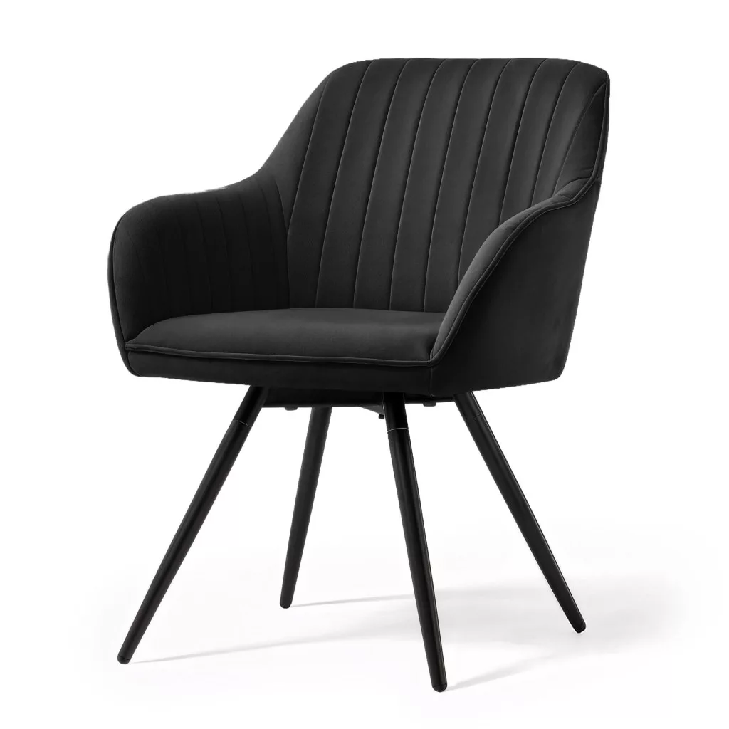 A TURNO forgószék a modern életstílus igényeire szabott, praktikus bútordarab. A 360°-os forgathatóság révén különleges használati kényelmet nyújt, különösen kisebb terekben, ahol nem szükséges a széket folyamatosan eltolni. Az elegáns fekete welúr kárpit függőleges varrásokkal díszített, amely nemcsak vizuálisan vonzó, de a nagy sűrűségű habszivacs töltettel együtt kiváló ülési komfortot is biztosít.