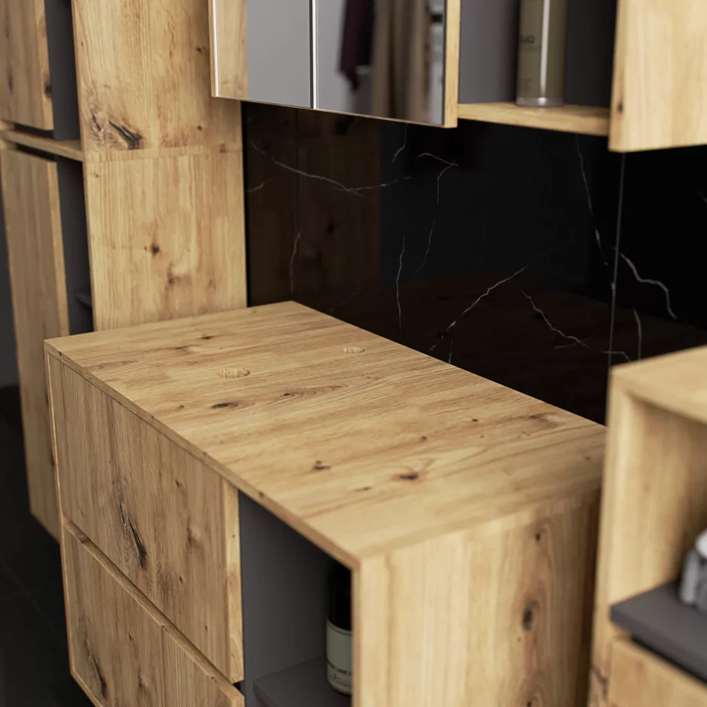 A VAMI 90 mosdó alatti szekrény ötvözi a funkcionalitást és az esztétikumot. Az Artisan tölgy és grafit szürke színkombináció modern megjelenést kölcsönöz, míg a két tágas fiók és két nyitott polc maximális tárolóhelyet biztosít. A szekrény speciálisan kialakított fiókjai lehetővé teszik a szifonok és vízvezetékek praktikus elhelyezését.