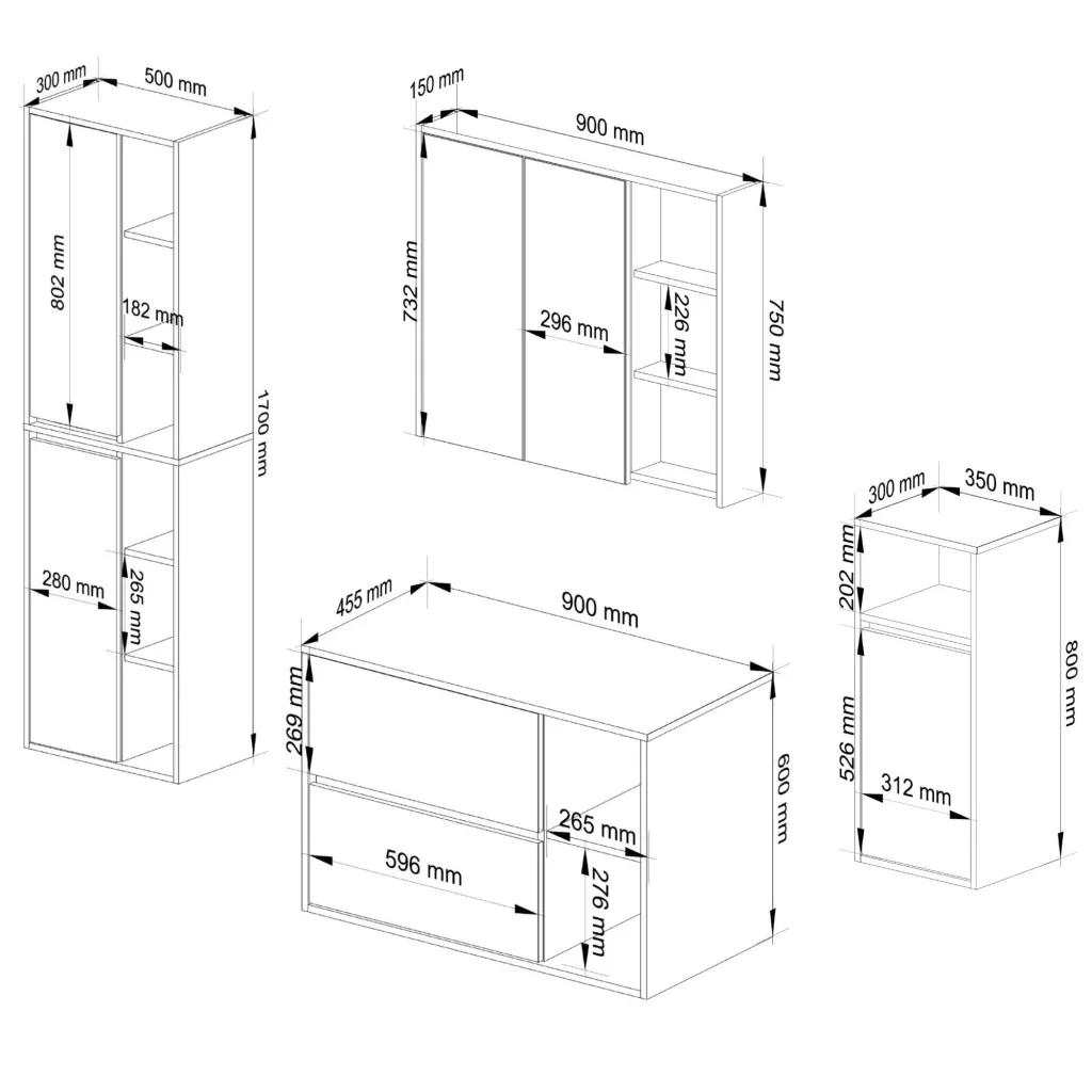 A szett négy független elemből áll: egy 90 cm-es mosdószekrényből két fiókkal, egy 90 cm-es tükrös szekrényből, egy magas tárolószekrényből és egy kiegészítő fali szekrényből. A nyitott polcok és zárt tárolóterek ideális kombinációja maximális rugalmasságot biztosít a fürdőszobai kellékek rendszerezésében.
