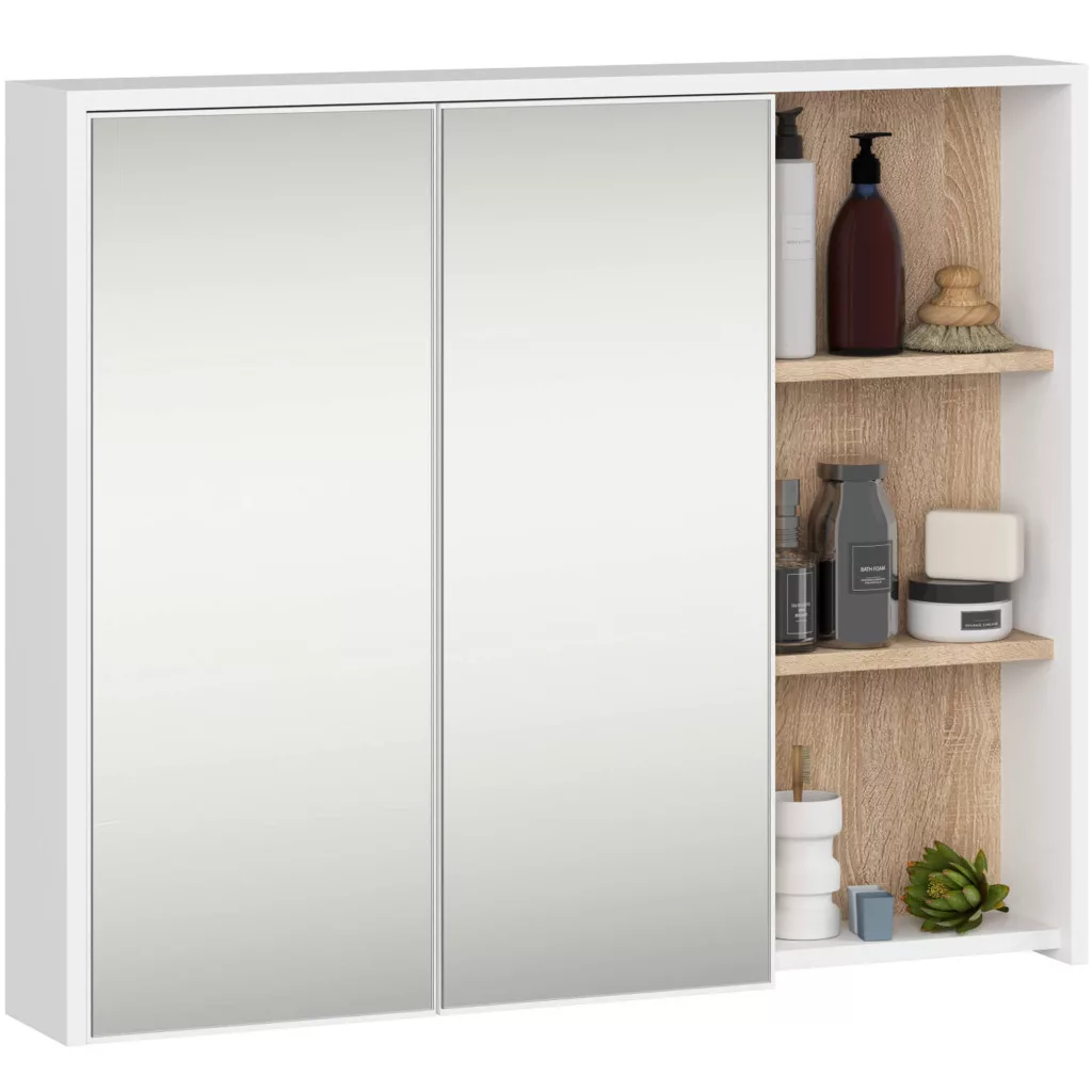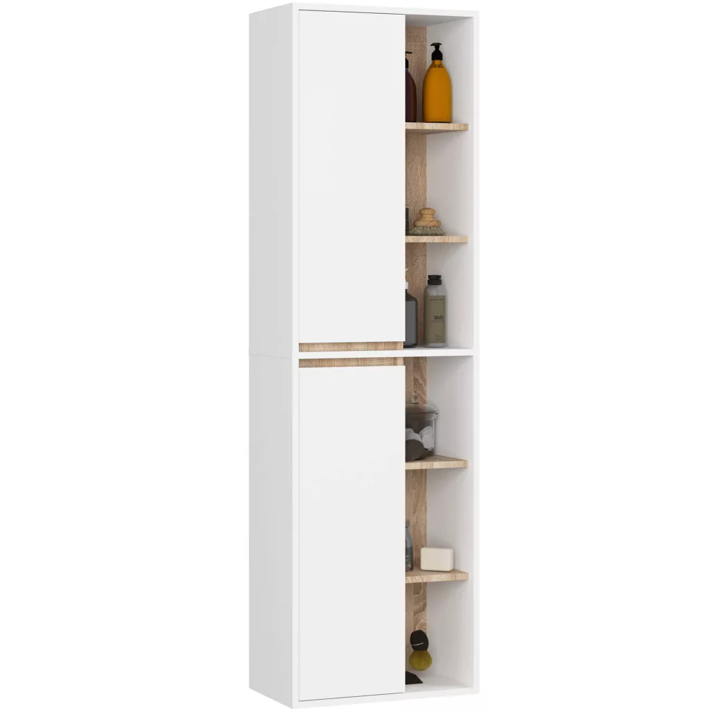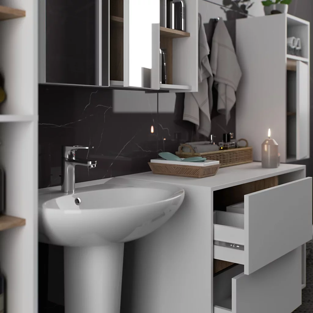 A VAMI fürdőszobabútor kollekció a kortárs design és funkcionalitás tökéletes ötvözete. A 16 mm-es laminált bútorlapból készült szett fehér matt felületei és sonoma tölgy részletei harmonikus kontrasztot alkotnak, míg az ABS élzárás tartósságot biztosít.