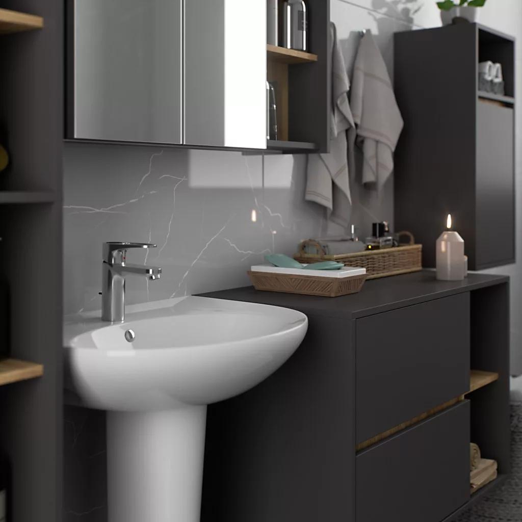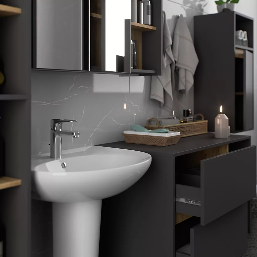 A VAMI fürdőszobabútor kollekció tökéletes összhangot teremt a funkcionalitás és a design között. A grafit szürke matt felületek és az artisan tölgy részletek harmonikus kontrasztot alkotnak, míg a nyitott polcrendszer könnyedséget kölcsönöz a bútoroknak. A szett négy független elemből áll, amelyek tetszés szerint kombinálhatók.