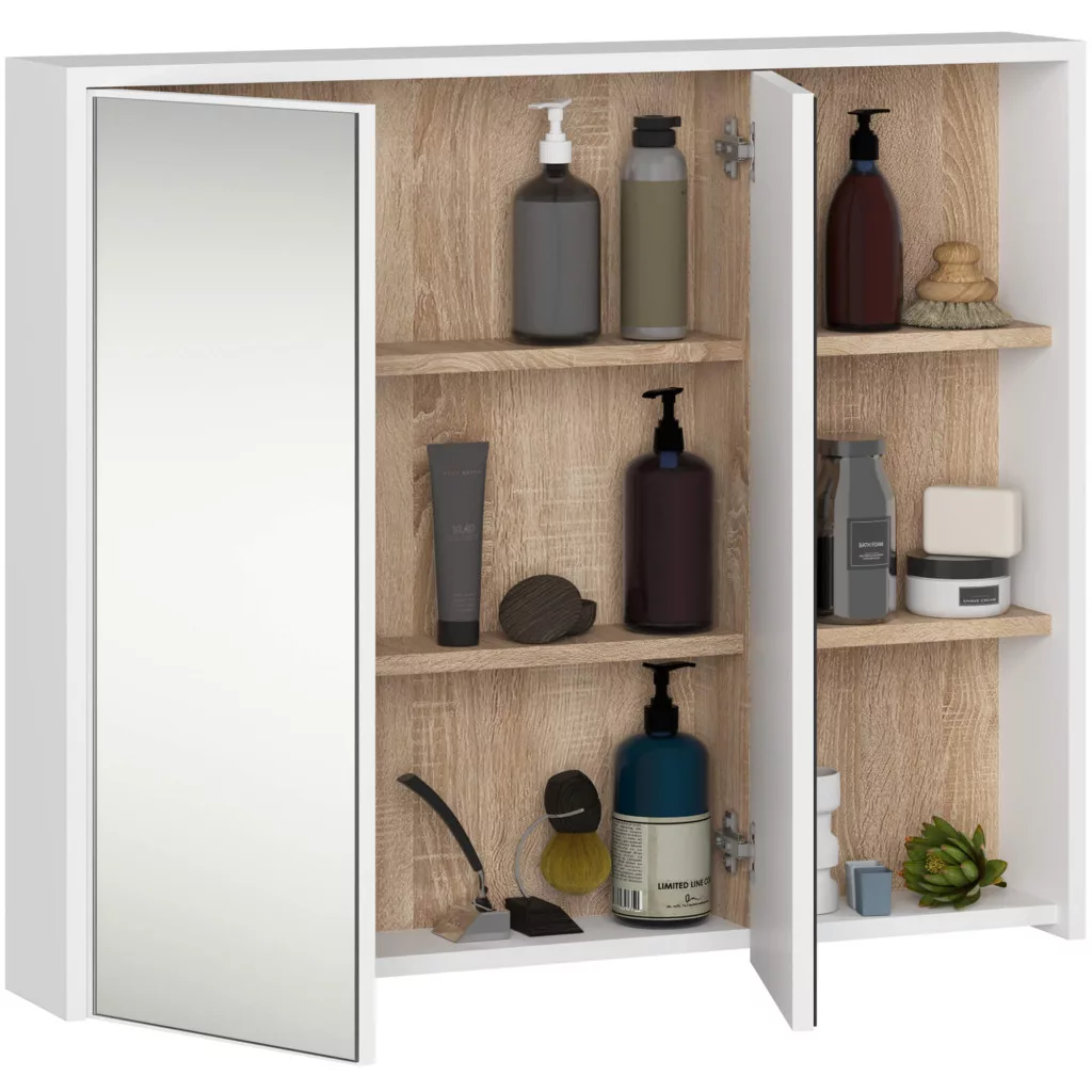 A VAMI tükrös fürdőszobai szekrény praktikus és stílusos megoldást kínál a mindennapi fürdőszobai rutinhoz. A két tükrös ajtó mögött három belső polc található, míg a nyitott részen további három polc biztosít helyet a gyakran használt termékeknek. A fehér korpusz és sonoma tölgy elemek harmonikus kombinációja modern megjelenést kölcsönöz.