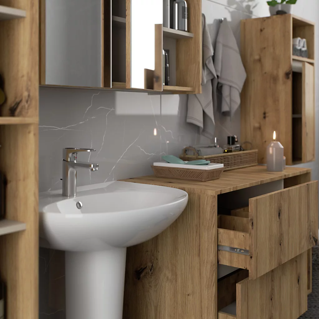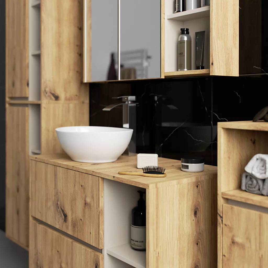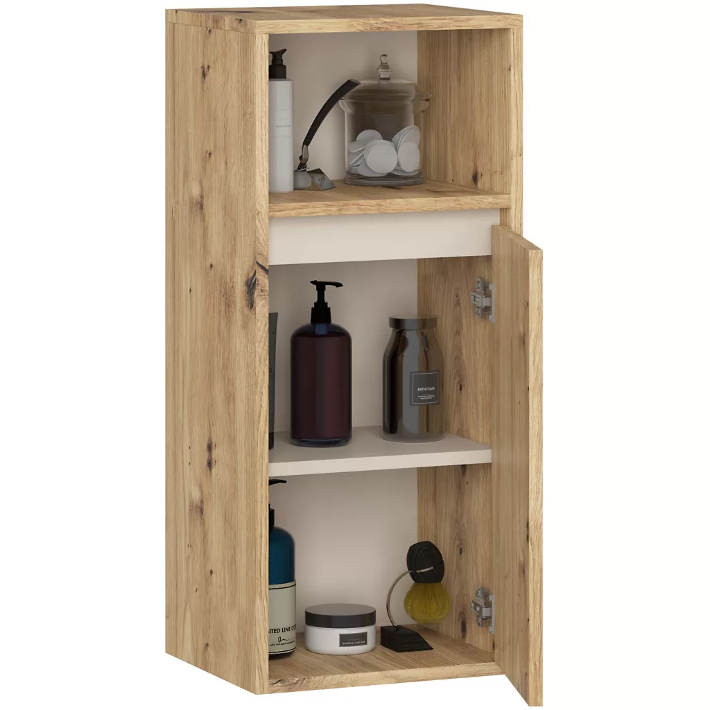 Kompakt, fali fürdőszobai szekrény 3 polccal, amely tökéletes megoldást nyújt a kisebb fürdőszobák tárolási igényeire. Artisan tölgy és kasmír színkombinációban.