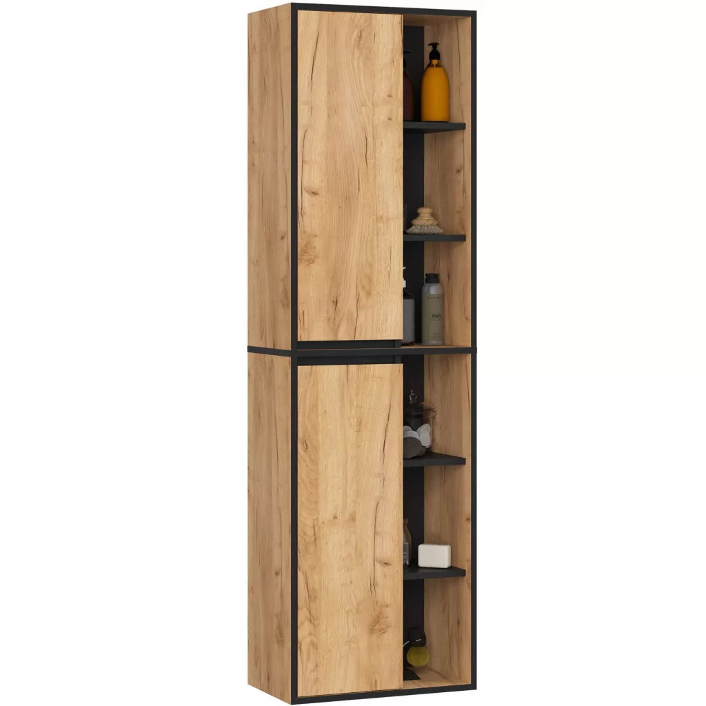 A VAMI W50 fali fürdőszobai szekrény tökéletes megoldást nyújt a fürdőszobai kellékek rendszerezett tárolására. A craft tölgy és fekete színkombináció modern megjelenést kölcsönöz, míg a két ajtós kialakítás és a praktikus polcrendszer maximális helykihasználást biztosít.