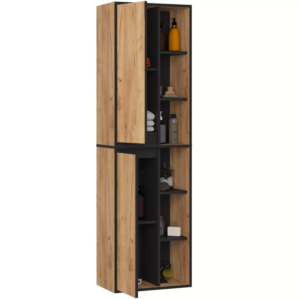 Modern, magas fürdőszobai szekrény két ajtóval és nyitott polcokkal, amely maximális tárolási megoldást kínál kompakt kialakításban.